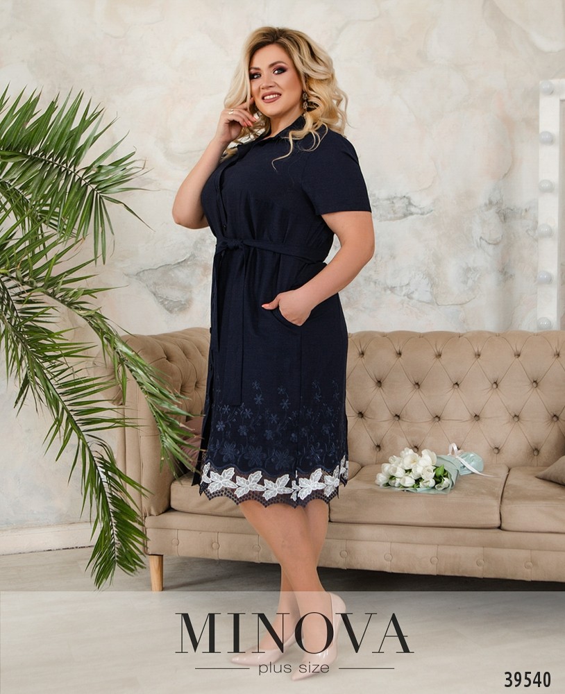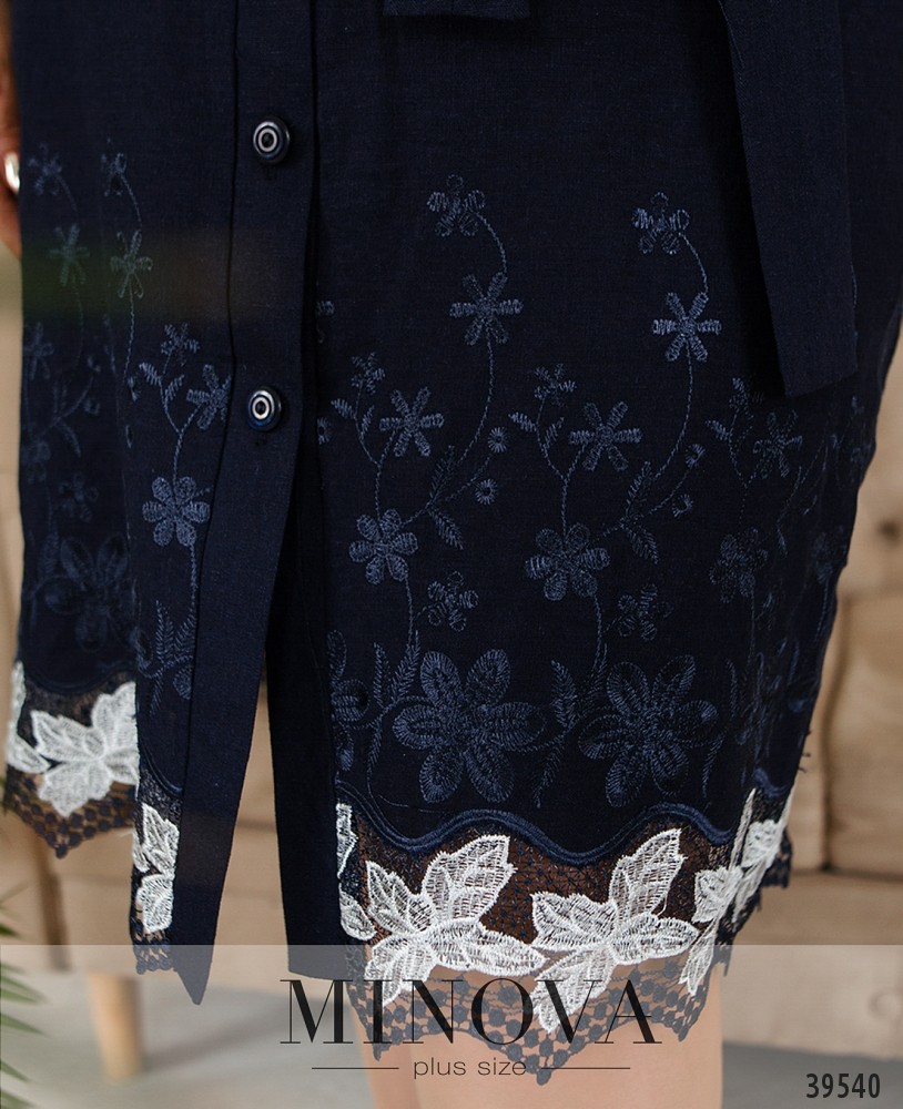 Минималистичное и элегантное платье-рубашка с поясом, застёгивается на ряд пуговиц спереди на планке. Воротничок отложной, рукава короткие, без манжет. Силуэт приталенный. По бокам - врезные карманы. Подол украшен очаровательной вышивкой и нежным кружевом.