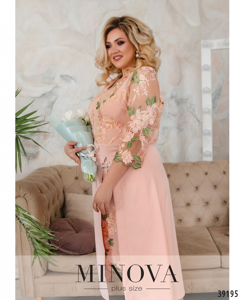 Нарядное вечернее платье батал с ажурной сеточкой на лифе, украшенной вышивкой - спереди и по спинке. Лиф с подкладкой, рукава - из прозрачной сеточки, без манжет. Подол подшит к верху, с разрезом, прихваченным двумя декоративными металлическими нашивками, под ним - вставка сеточки с вышивкой. Сзади на подоле шлица, застёжка - вшитая по спинке молния. Карманов нет. Вырез горловины неглубокий.