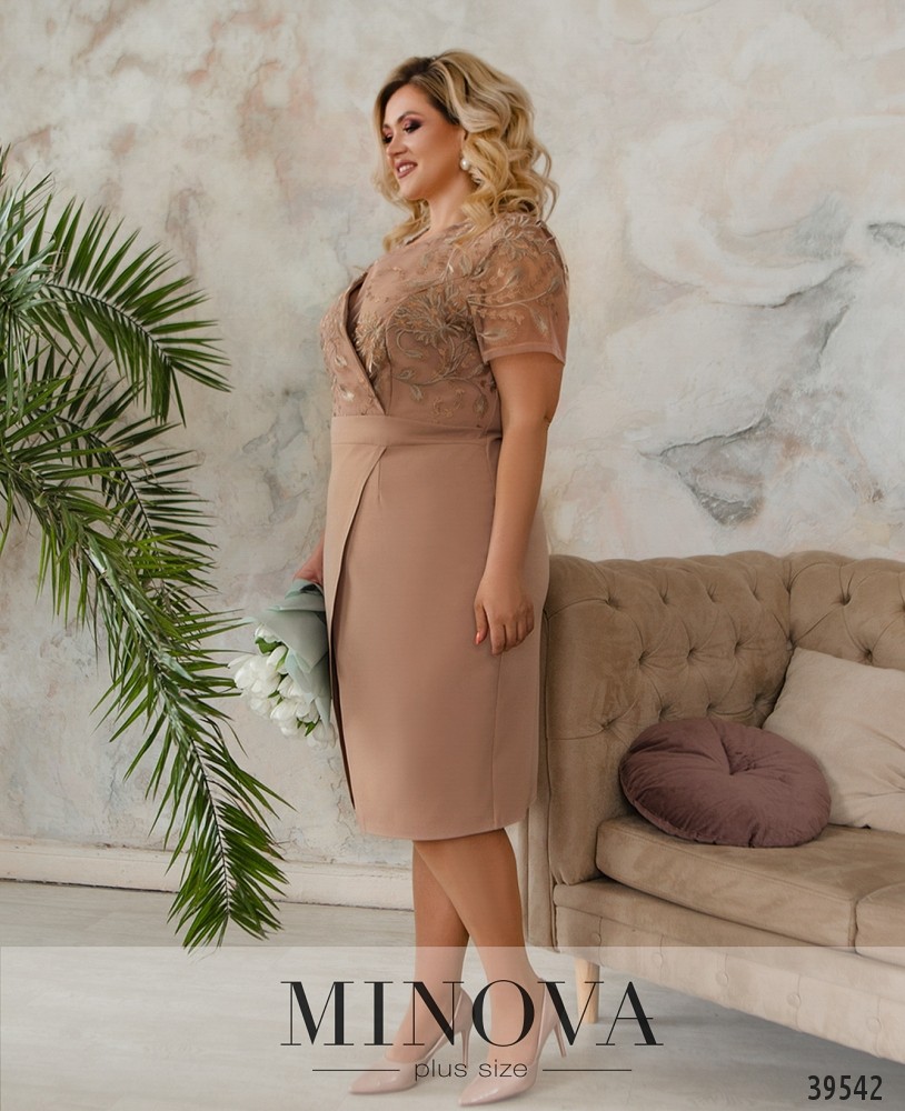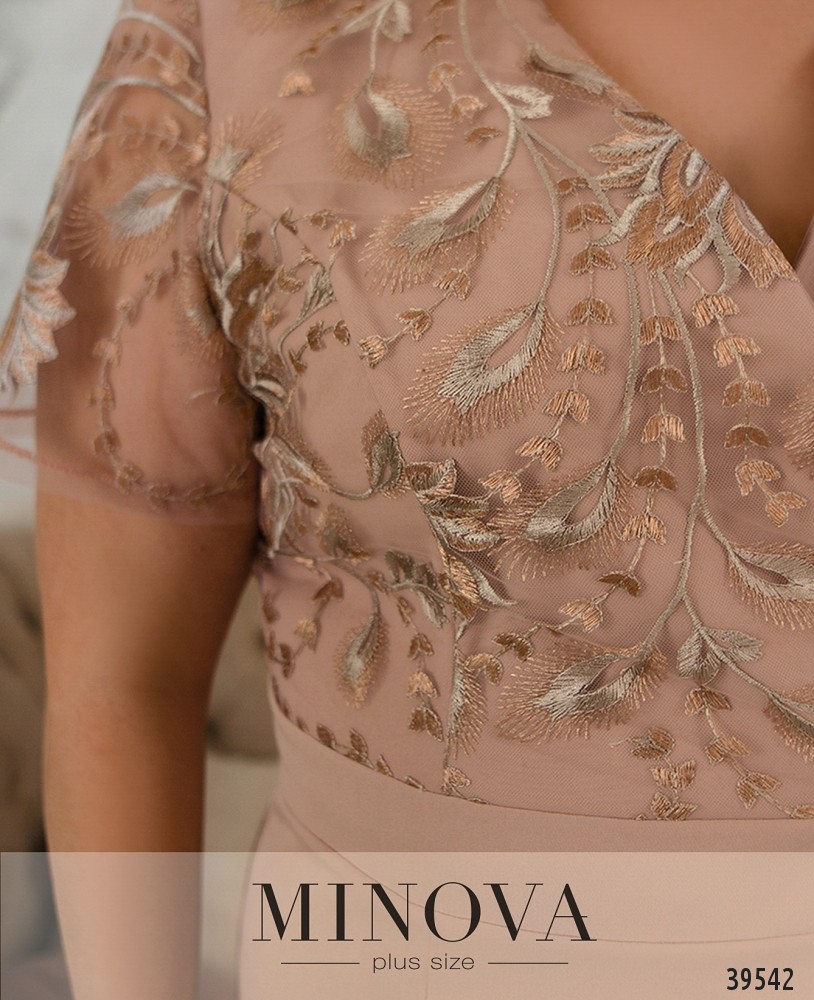 Привлекательное вечернее платье с ажурной нашитой на лиф сеточкой, украшенной вышивкой. Рукава полностью из прозрачной сеточки. На груди вытачки. Подол подшит на запАх, снизу вырез со вставкой-сеточкой. Застёжка - вшитая по спинке молния, сзади на подоле шлица.