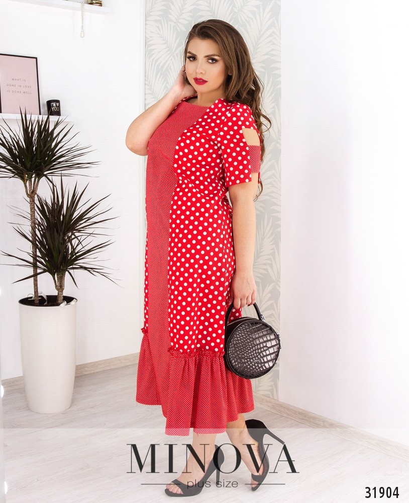 Платье в мелкий и крупный горох. Платье с короткими рукавами, с воланами на подоле и вертикальной вставкой по всей длине. Рукава выполнены с вырезами. Подол оформлен воланами и мелкими рюшами по линии отреза.