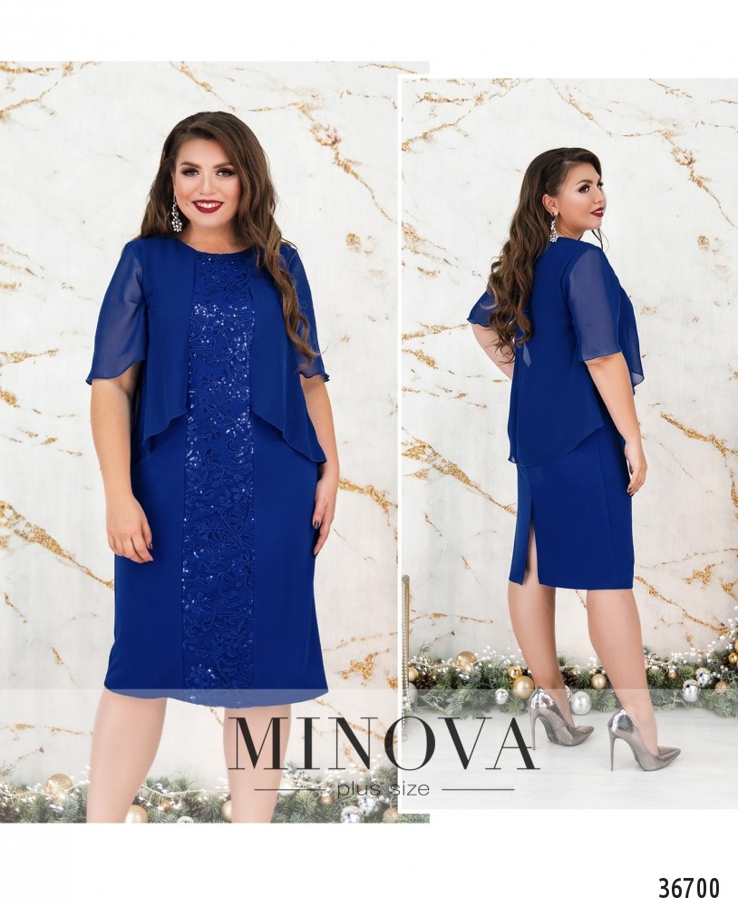 Нужно выглядеть нарядно и в то же время сдержанно? Minova предлагает отличный вариант платья батал. Платье прямого кроя, но эта особенность сглаживается подшитой сверху накидкой, ниспадающей мягкими асимметричными складками. Ткань мягкая, приятная к телу. Спереди по центру – широкая полоса с вышивкой и пайетками, от полукруглого выреза горловины до подола. Карманы и застёжки отсутствуют. Накидка из полупрозрачной ткани, сзади полностью закрывает спинку до бедра. Рукава до локтя, без подкладки и манжет, полупрозрачные, свободные. Платье длины миди, будет хорошо смотреться на любой фигуре с обувью на танкетке или каблуке.