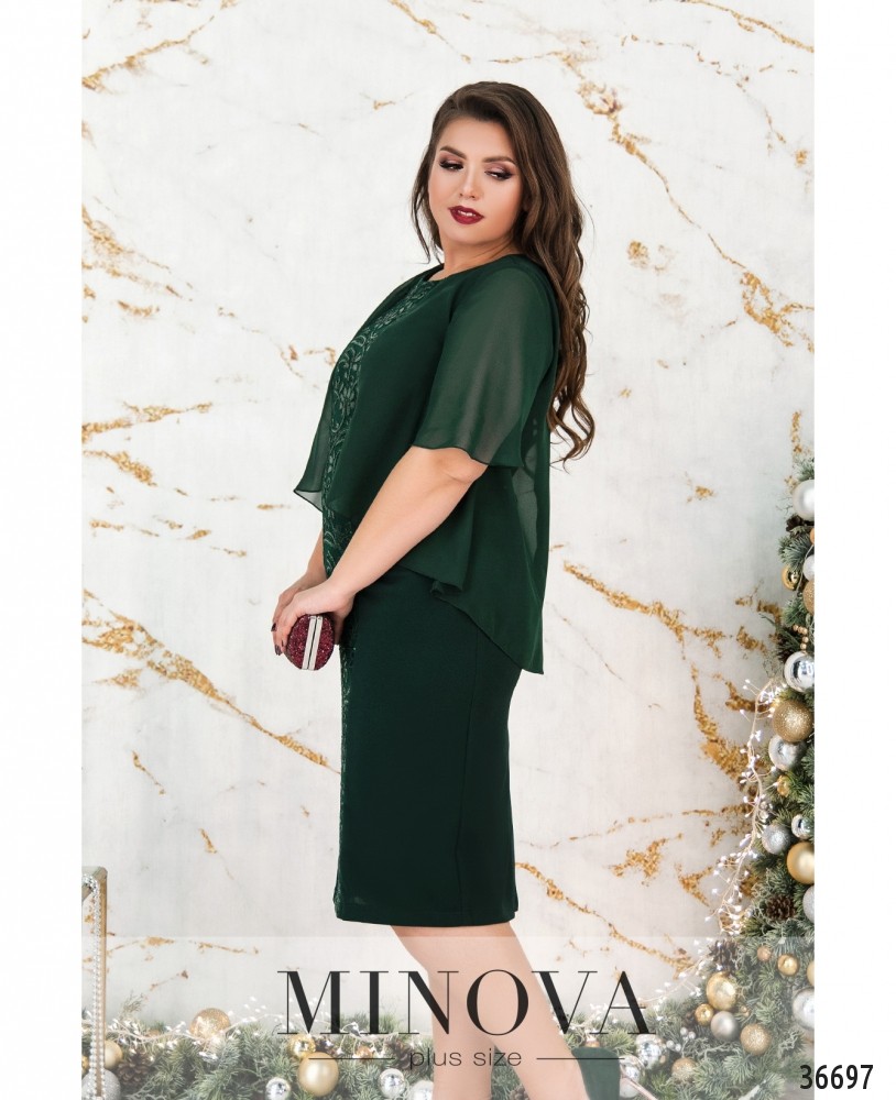 Нужно выглядеть нарядно и в то же время сдержанно? Minova предлагает отличный вариант платья батал. Платье прямого кроя, но эта особенность сглаживается подшитой сверху накидкой, ниспадающей мягкими асимметричными складками. Ткань мягкая, приятная к телу. Спереди по центру – широкая полоса с вышивкой и пайетками, от полукруглого выреза горловины до подола. Карманы и застёжки отсутствуют. Накидка из полупрозрачной ткани, сзади полностью закрывает спинку до бедра. Рукава до локтя, без подкладки и манжет, полупрозрачные, свободные. Платье длины миди, будет хорошо смотреться на любой фигуре с обувью на танкетке или каблуке.