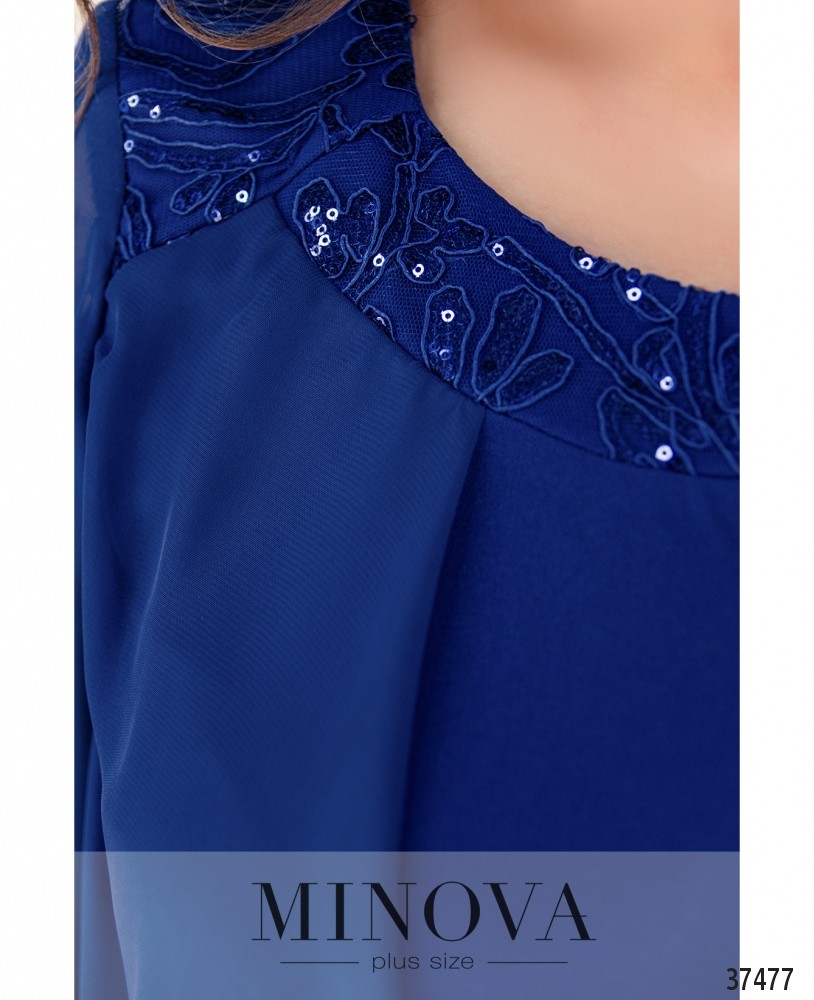 Нарядное платье большого размера с подшитой лёгкой накидкой. Крой прямой, застёжек и карманов нет. Вырез горловины полукруглый, неглубокий, украшен кружевом и пайетками. Рукава расклешённые, из полупрозрачной ткани без подкладки. Сзади накидка ровная, спереди ниспадает оборками.