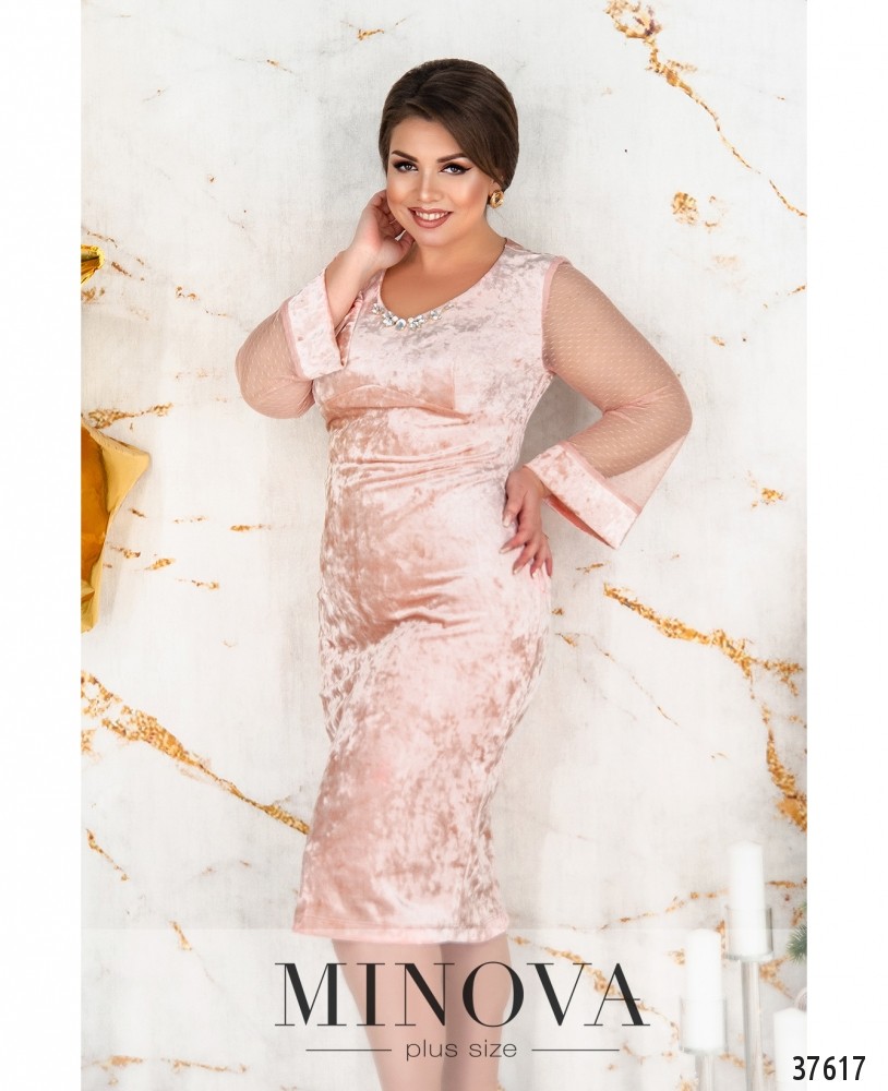 Элегантное вечернее платье плюс сайз с высокой талией, без карманов и застёжек, вырез горловины V-образный, украшен стразами. На рукавах из полупрозрачной сеточки - плотные манжеты.