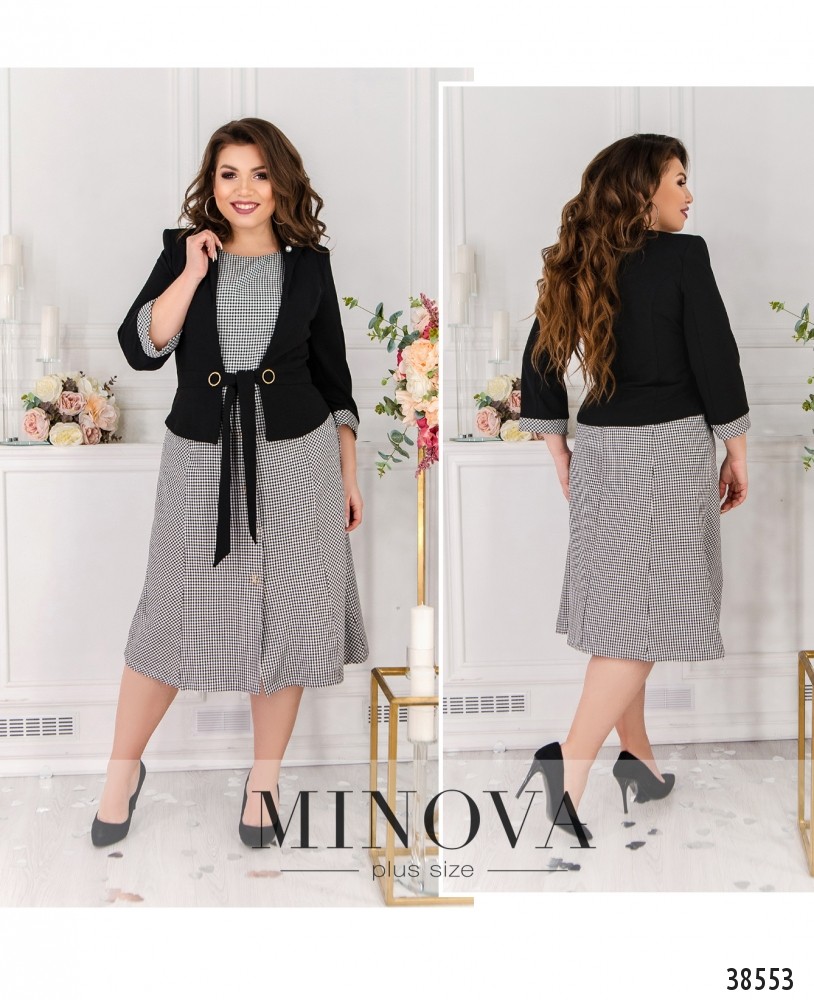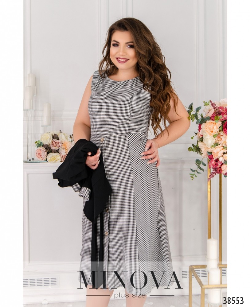 Милое и оригинальное платье большого размера с жакетом. Платье без рукавов и карманов, с полукруглым вырезом горловины, подол подшит к верху, на нём - ряд пуговиц на планке. Жакет с пояском и круглыми украшениями, рукава с контрастными манжетами, в тон платью, без подкладки, без карманов, в наличии подплечники и украшение-брошь на лацкане.