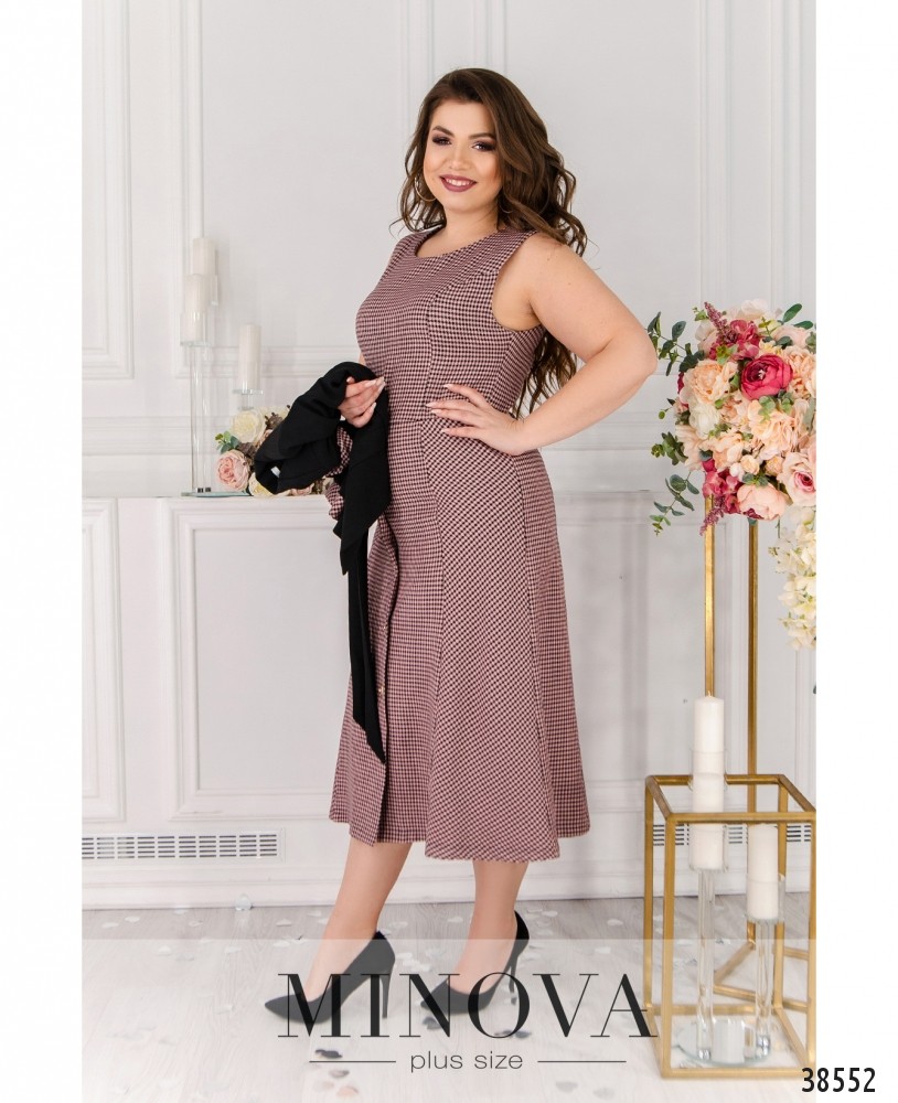 Милое и оригинальное платье большого размера с жакетом. Платье без рукавов и карманов, с полукруглым вырезом горловины, подол подшит к верху, на нём - ряд пуговиц на планке. Жакет с пояском и круглыми украшениями, рукава с контрастными манжетами, в тон платью, без подкладки, без карманов, в наличии подплечники и украшение-брошь на лацкане.