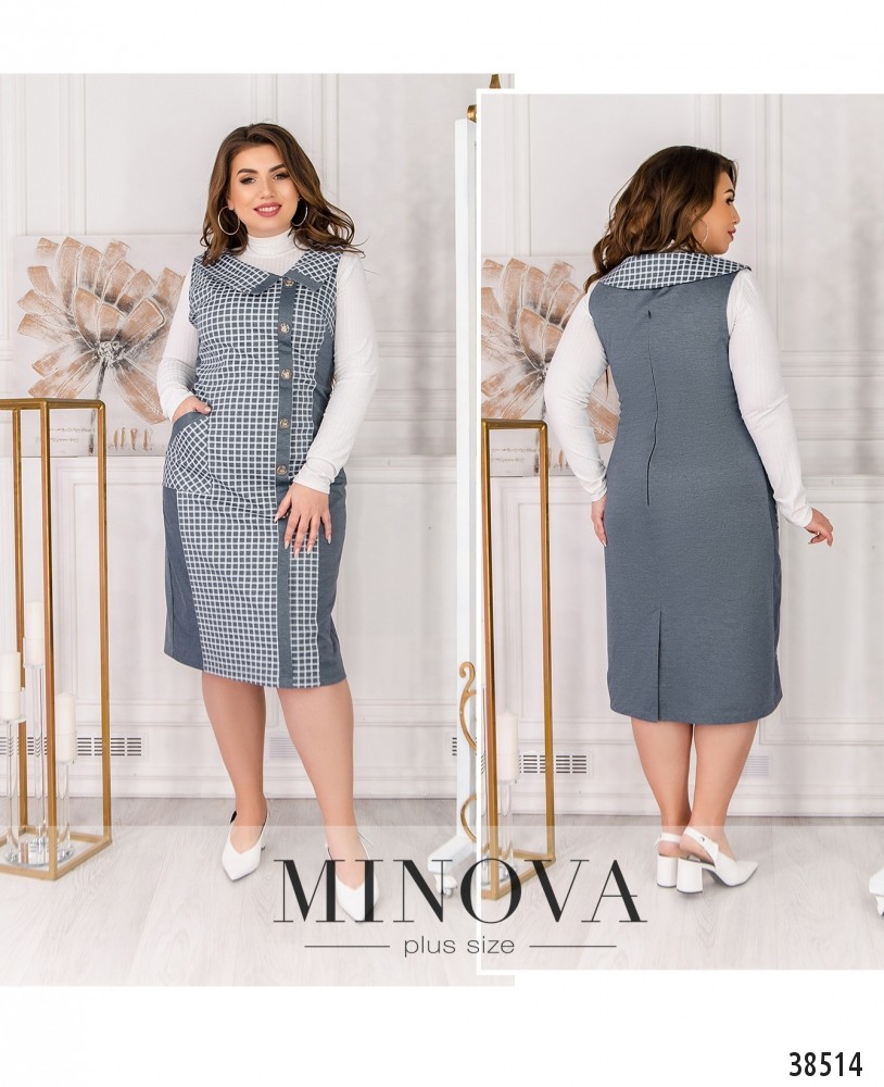 Привлекательное и оригинальное платье батал без рукавов, спереди слева - ряд декоративных пуговиц на планке. Рабочая застёжка - вшитая по спинке молния. Воротничок отложной, асимметричный. На груди вытачки. Справа на бедре - накладной карман. Силуэт приталенный, сзади на подоле шлица.