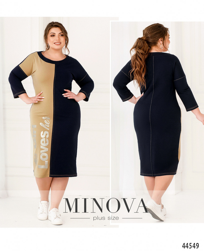 Элегантное контрастное платье плюс сайз с вырезом горловины "лодочка" и принтом на светлой стороне. Спинка однотонная. Вырез горловины с манжетом, рукава без манжет. Линия плеча приспущена. Карманов и застёжек нет.