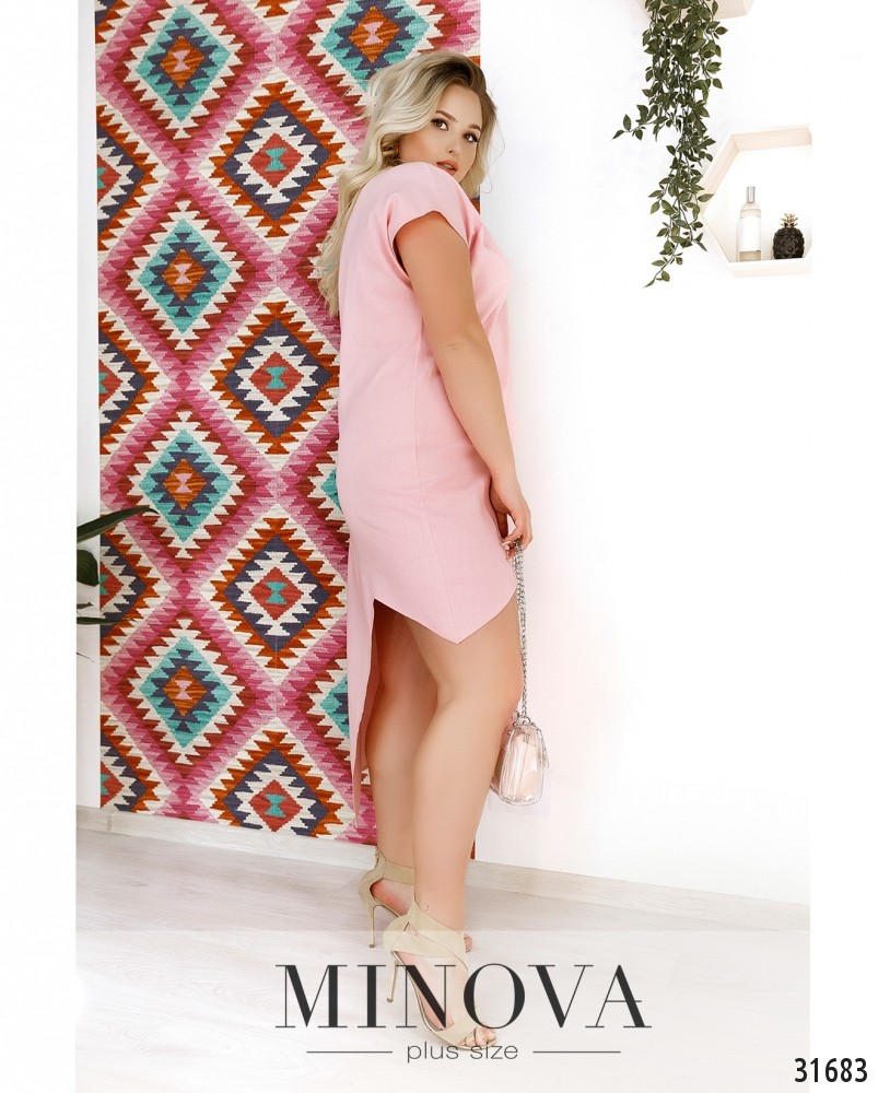 Яркое трендовое платье с короткими рукавами и круглым вырезом. Платье с ассиметричным подолом.
