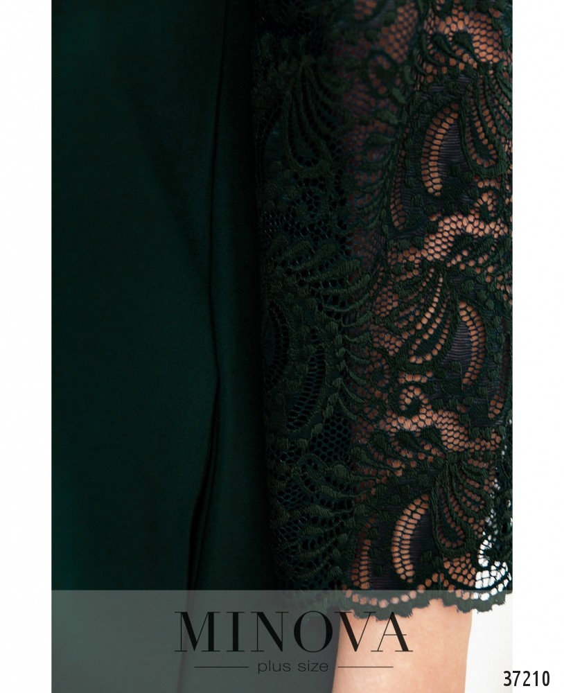 Не совсем стандартный крой представленного в новой коллекции женской одежды от Minova платья будет удачно подчёркивать достоинства «прямоугольной» и «грушевой» фигуры. На подоле от талии – диагональные вытачки до низу, так что платье получается асимметричным и создаёт эффект приталенности. Тем не менее, это платье А-силуэта. По бокам – врезные карманы. Ткань лёгкая и мягкая, а рукава – из прозрачного цветочного гипюра, без манжет. Гипюр украшает спинку до талии, и подол от него присобран, так что в итоге платье выглядит сзади более нарядным, чем спереди. Застёжек нет. Стоит дополнить образ туфельками на каблуке или танкетке.