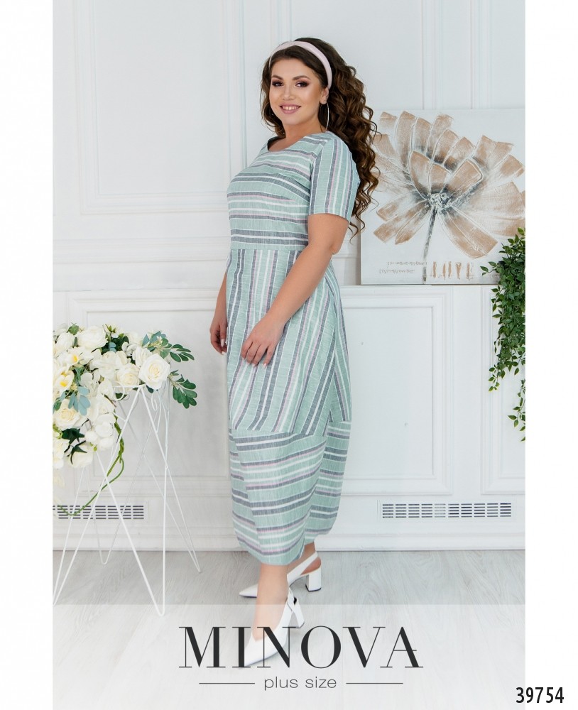 Стильное полосатое платье большого размера без карманов, на подоле - декоративные пуговицы, под ними - разрез, на груди вытачки. Застёжка - вшитая по спинке молния.