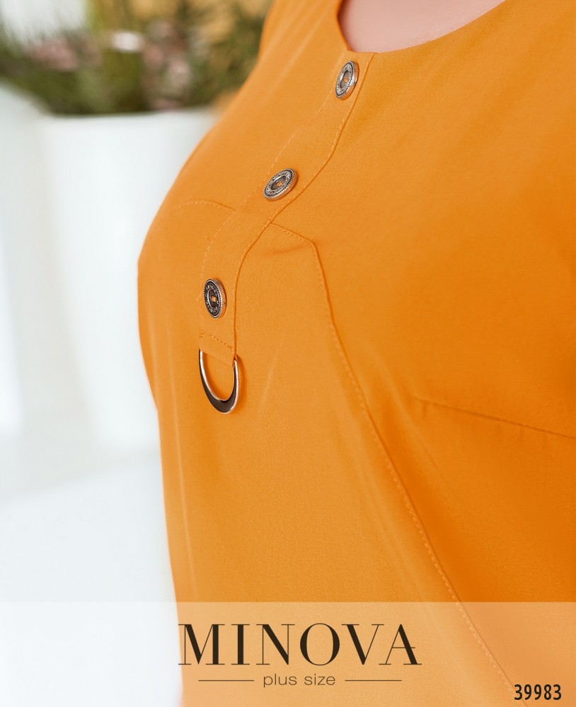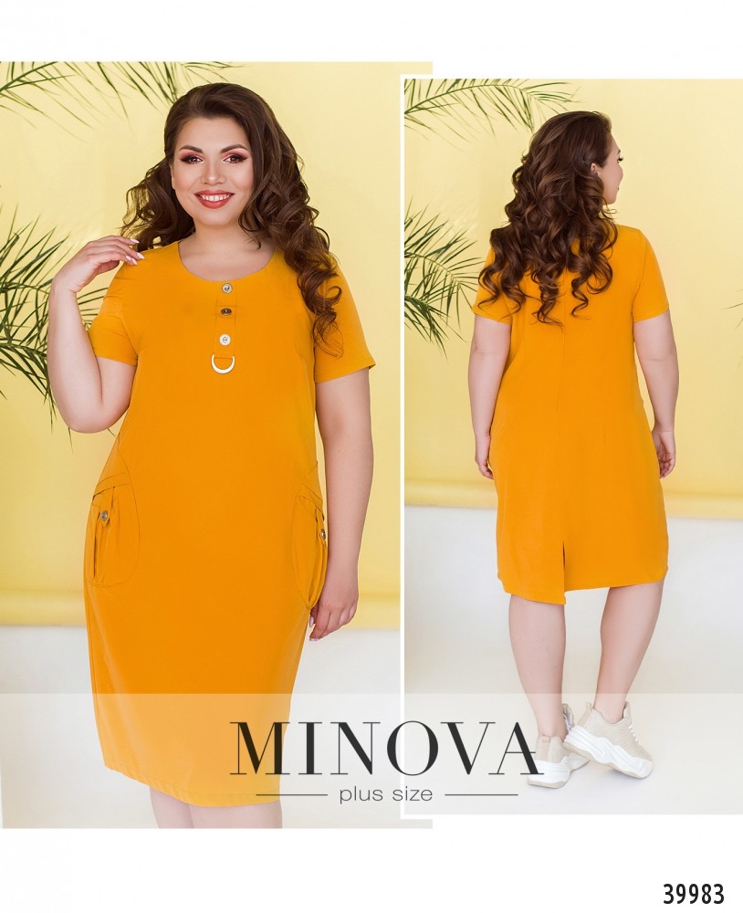 Оригинальное платье батал с декоративными пуговицами под полукруглым вырезом горловины, планка оканчивается металлическим полукольцом. Функциональная застёжка - вшитая по спинке молния, начинается чуть ниже выреза горловины. Сзади на подоле шлица. По бокам - накладные карманы, украшенные лентами с пуговицами. Рукава свободные, без манжет.