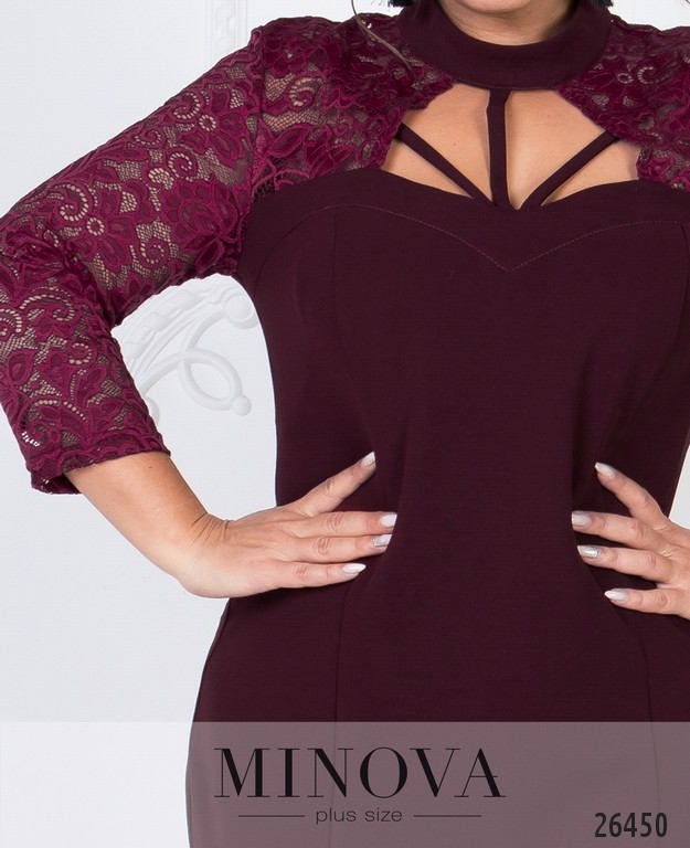 Женственное платье по фигуре, подчеркивающее сексуальные изгибы тела. Крой лифа вверху напоминает бюстье. Декольте оформлено в виде геометрического выреза с высокой горловиной, кружевом и декоративными планками. Рукава и отрезная кокетка на спине выполнены из кружева. Зауженный подол оформлен широкой кружевной полосой. На спине платье застегивается на скрытую молнию.