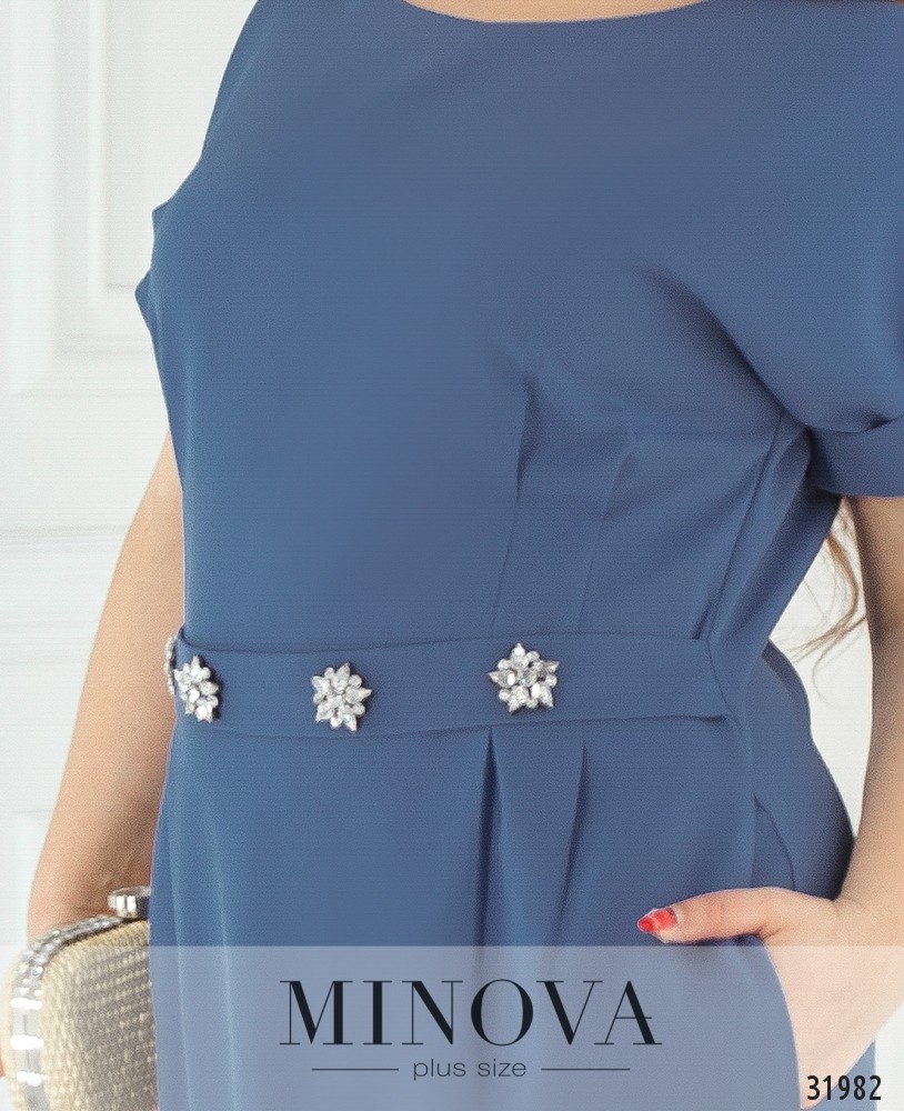 Платье по фигуре с акцентом на талии. Платье с короткими рукавами, собранными во внешние манжеты. От линии пояса подол оформлен защипами и дополнен карманами. Талия подчеркнута поясом-вставкой с блестящими брошами. Спинка выполнена со вшитой молнией.