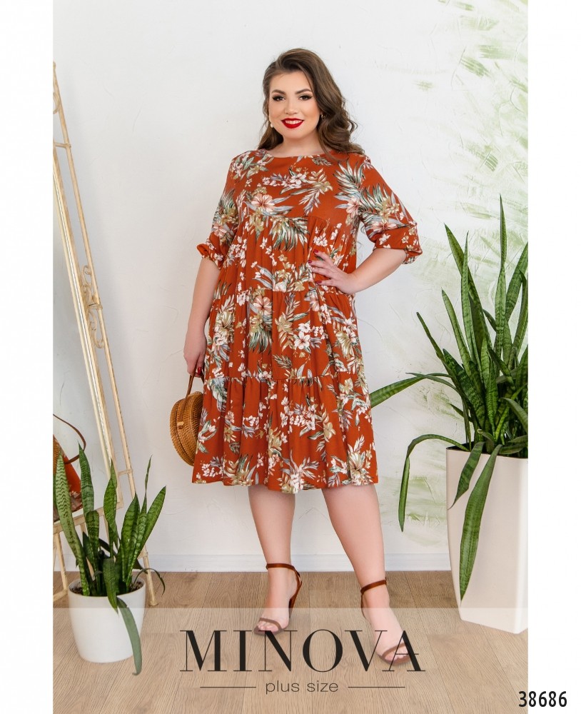 Удобное и яркое повседневное платье с цветочным принтом и с однотонной подкладкой. Рукава без подкладки, в манжеты вшита резинка, карманов и застёжек нет. Верхний слой - с несколькими рядами оборок. Вырез горловины "лодочка".
