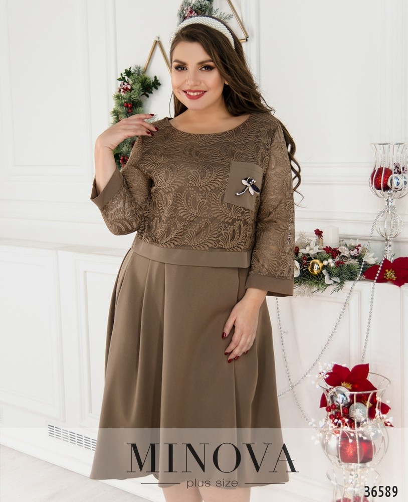 Такое мягкое и ажурное кружево, такая приятная подкладка! Да и в общем платье производит очень приятное впечатление. Minova представляет новую модель платья батал с подшитой сверху кружевной накидкой, которая доходит до талии и оканчивается более плотным манжетом. Рукава полной длины, полностью из кружева с небольшими манжетами без пуговиц. На платье и на накидке на груди вытачки. На гружеве на левой стороне груди нашит небольшой накладной кармашек из гладкой ткани, украшенный очаровательной стрекозой. По бокам – врезные карманы. Платье с асимметричным подолом, по спинке чуть длиннее, вырез горловины широкий, полукруглый, застёжек нет. Прекрасный выбор для праздника! Украшение входит в комплект.