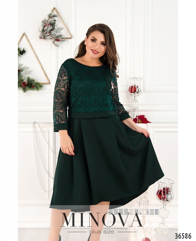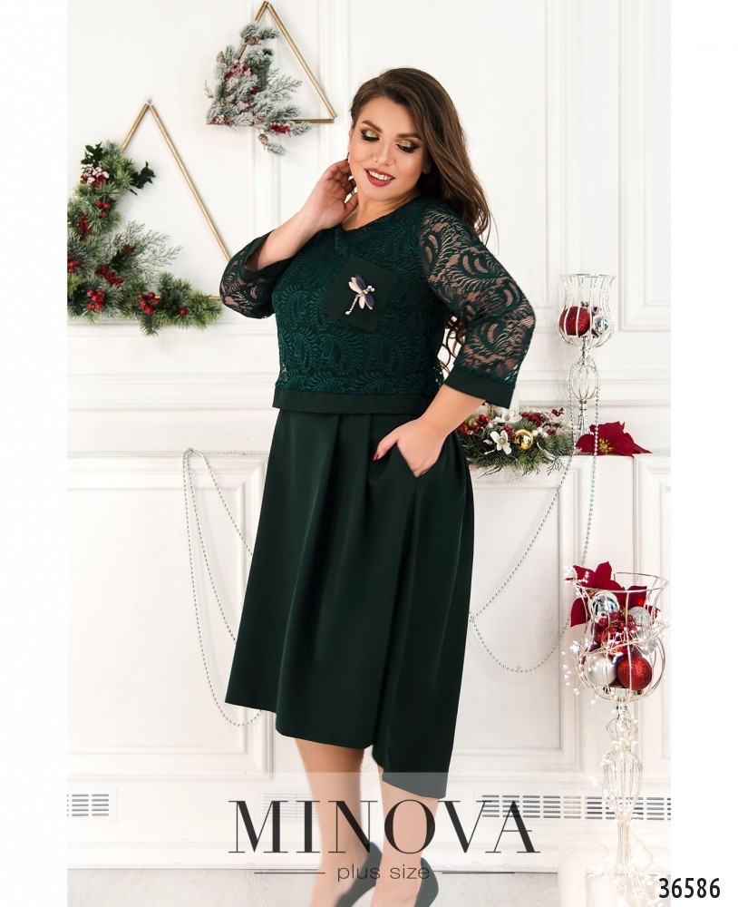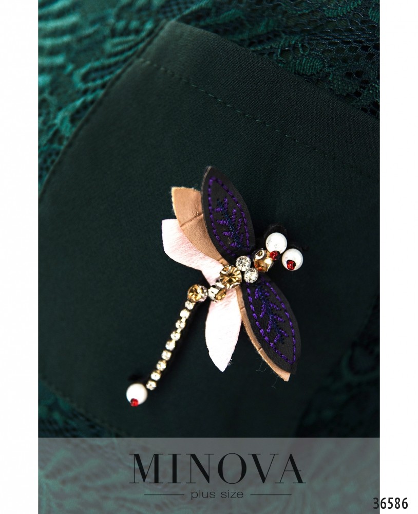 Такое мягкое и ажурное кружево, такая приятная подкладка! Да и в общем платье производит очень приятное впечатление. Minova представляет новую модель платья батал с подшитой сверху кружевной накидкой, которая доходит до талии и оканчивается более плотным манжетом. Рукава полной длины, полностью из кружева с небольшими манжетами без пуговиц. На платье и на накидке на груди вытачки. На гружеве на левой стороне груди нашит небольшой накладной кармашек из гладкой ткани, украшенный очаровательной стрекозой. По бокам – врезные карманы. Платье с асимметричным подолом, по спинке чуть длиннее, вырез горловины широкий, полукруглый, застёжек нет. Прекрасный выбор для праздника! Украшение входит в комплект.