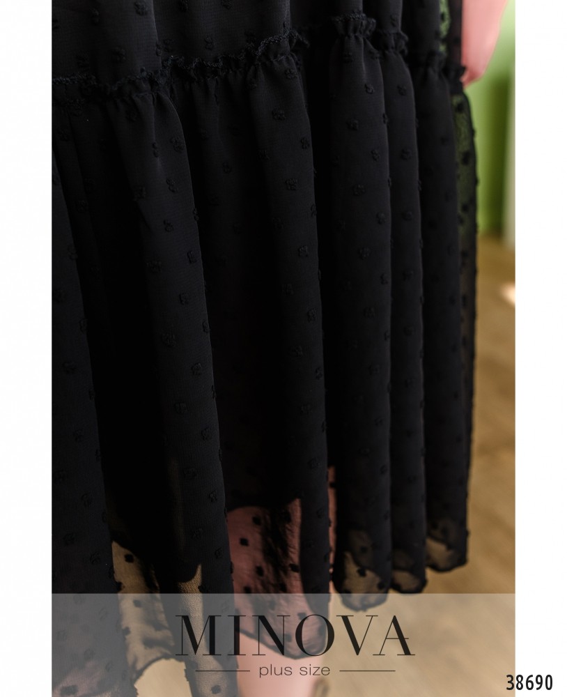 Лёгкое, удобное и привлекательное платье батал с подкладкой и сеточкой. Сеточка присобрана оборками в несколько рядов. Рукава - из сеточки без подкладки, на запястьях вшиты резинки. Карманов и застёжек нет, вырез горловины - "лодочка".