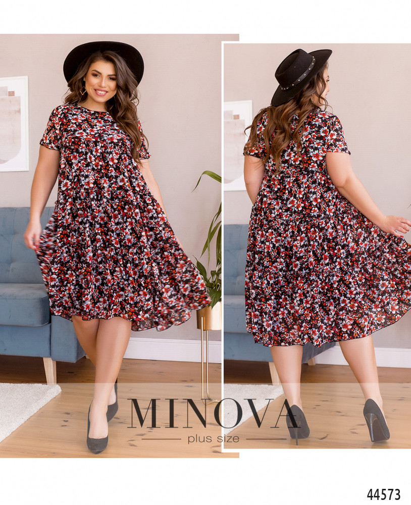 Стильное и романтичное платье батал с рукавами-фонариками, в которые вшиты резинки. Верхний слой - полупрозрачный, с несколькими рядами оборок, нижний - мягкая подкладка (рукава без подкладки). Застёжек и карманов нет.