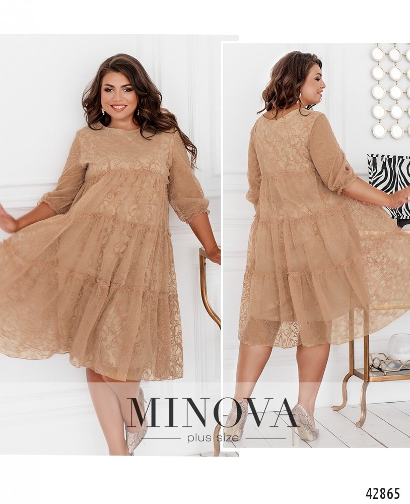 Яркое платье батал А-силуэта с несколькими рядами оборок на верхнем, полупрозрачном, слое, украшенном гипюром и блёстками. Нижний слой мягкий. Рукава с маленькими манжетами-оборками, в них вшиты резинки. Застёжек и карманов нет. Вырез горловины полукруглый.