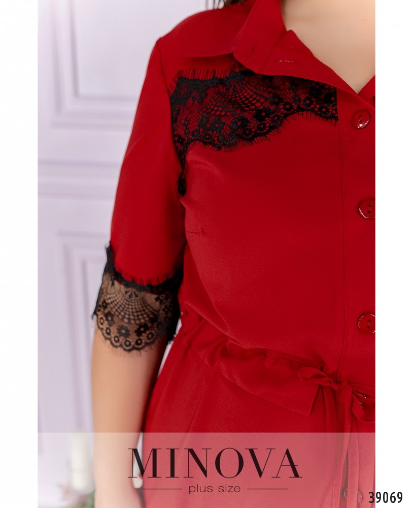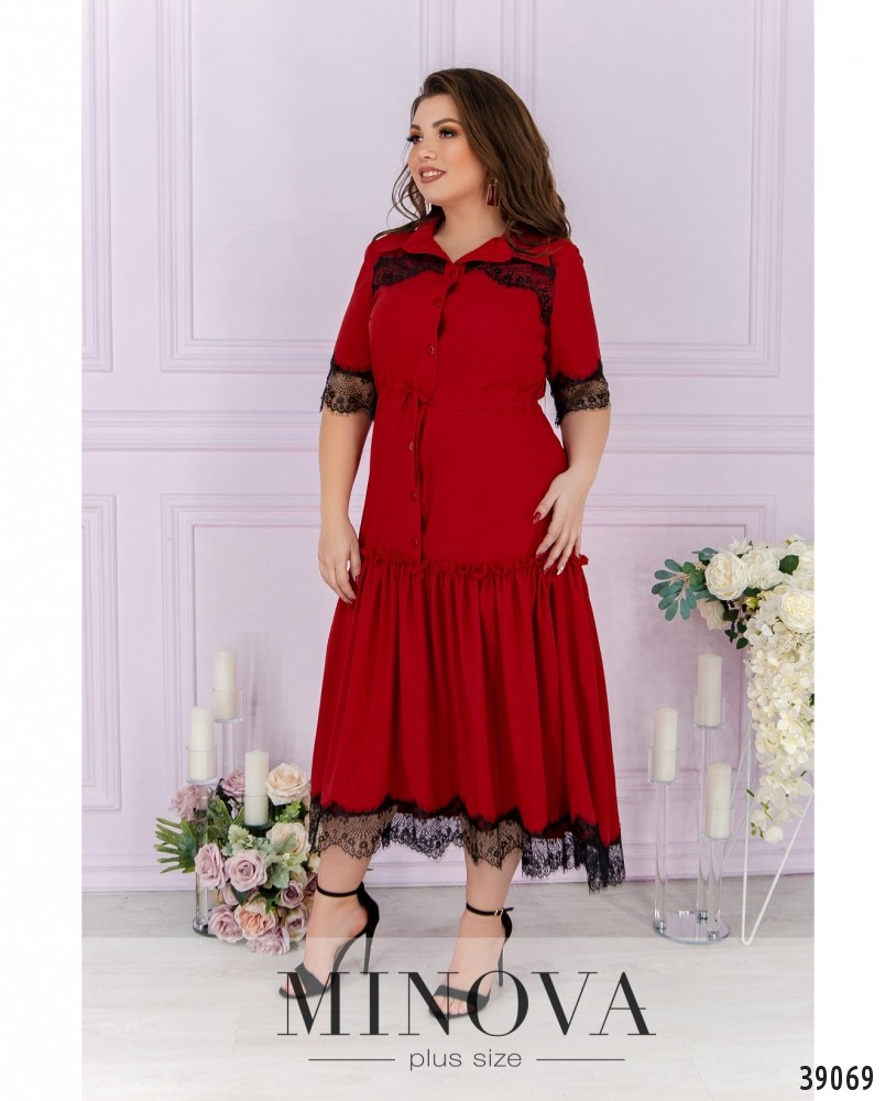Оригинальное платье большого размера А-силуэта, подол украшен мягкими оборками. На рукавах и груди - тонкое кружево. Застёгивается на пуговицы спереди на планке, от отложного воротничка до середины подола. Карманов нет, в пояс вшит шнурок.