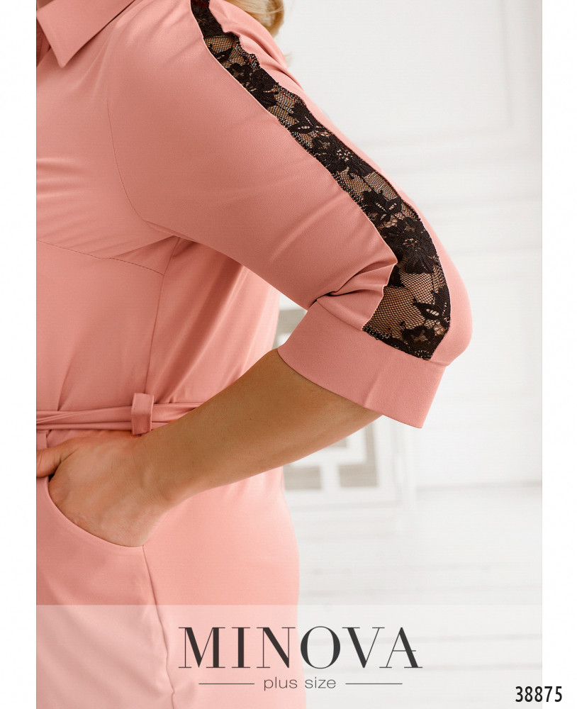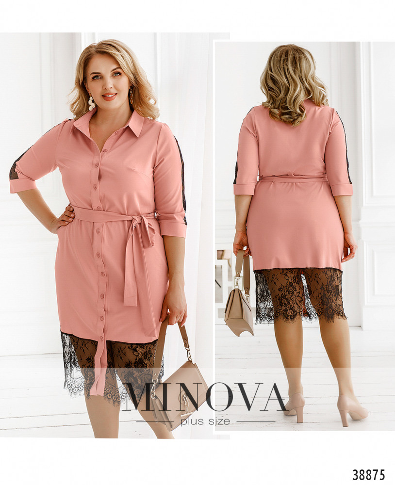 Экстравагантное платье-рубашка большого размера с отложным воротничком, рукава- с небольшими манжетами без пуговиц. Застёгивается на ряд пуговиц спереди на планке. Рукава и подол украшены тонким цветочным кружевом. По бокам - врезные карманы, на груди вытачки. В комплекте пояс в тон. Подол подшит к верху.