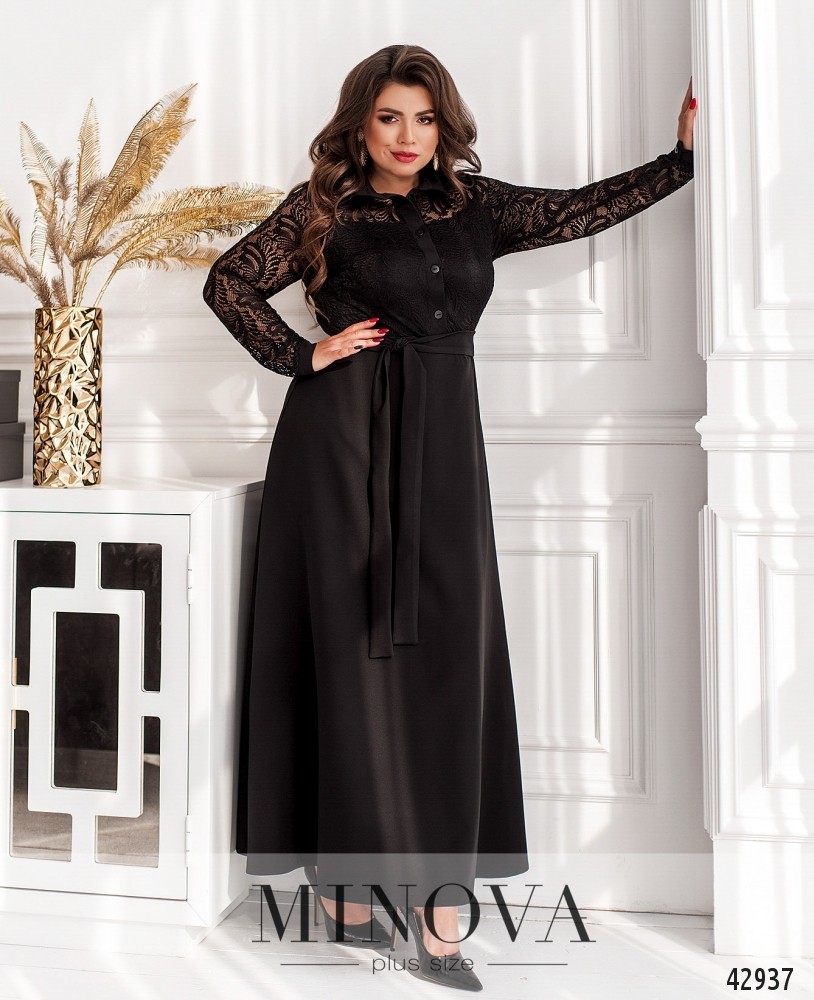 Элегантное платье большого размера с отложным воротничком и рядом пуговиц от воротничка до талии. Лиф украшен полупрозрачным гипюром, от талии до груди изнутри подкладка, а также продольные вытачки. Рукава без подкладки, с плотными манжетами, на манжетах по одной пуговице.