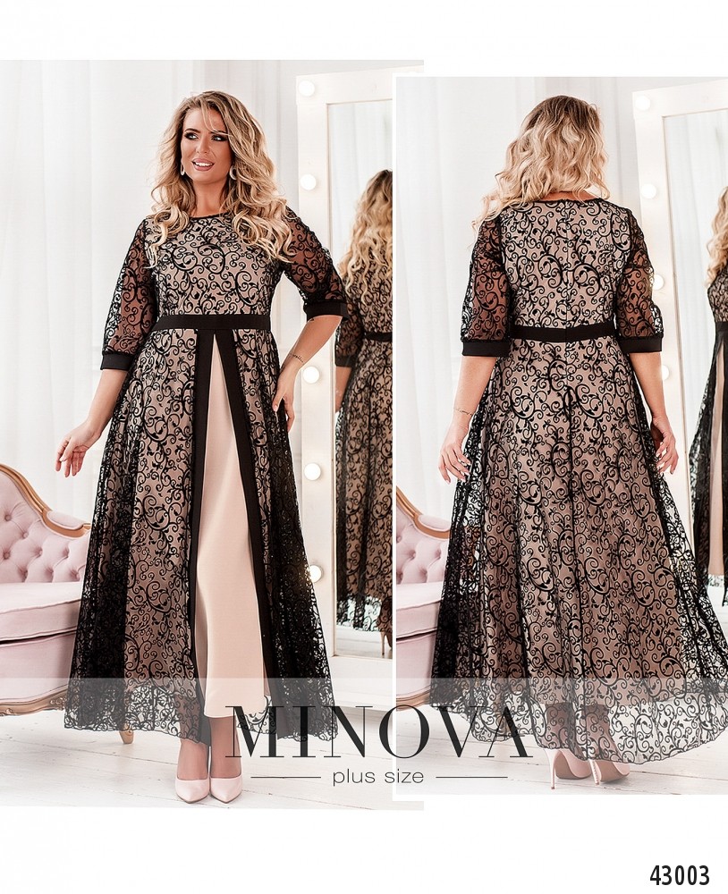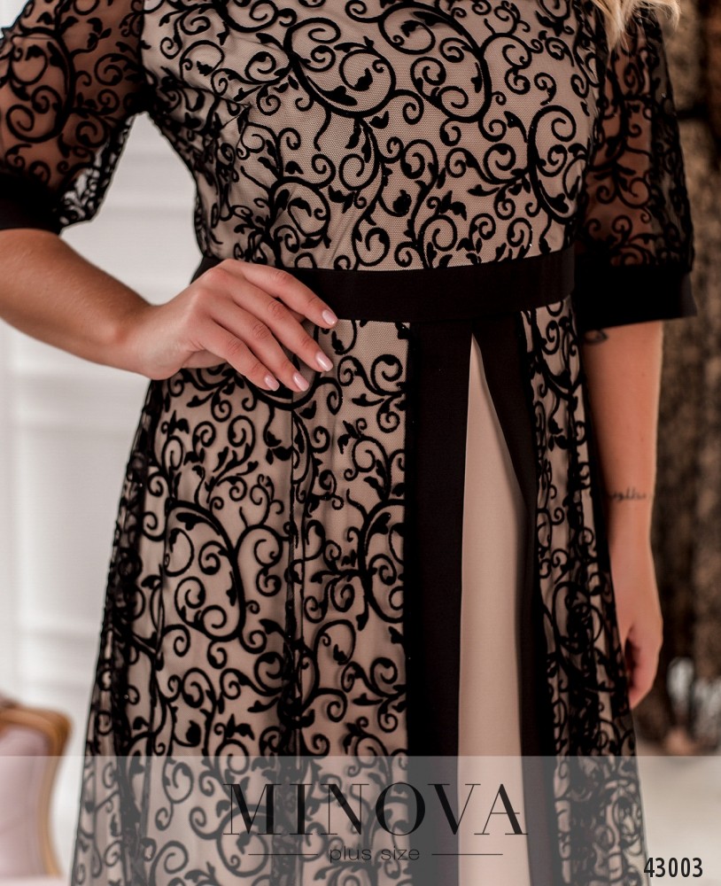 Нарядное платье батал без карманов, с потайной змейкой по спинке, с полукруглым вырезом горловины. Нижний слой мягкий, верхний - полупрозрачный узорчатый гипюр. Рукава без подкладки, с уплотнённым манжетом. Верхний слой на подоле подшит на талии, при ходьбе развевается, оторочен по краю разреза спереди плотной лентой.