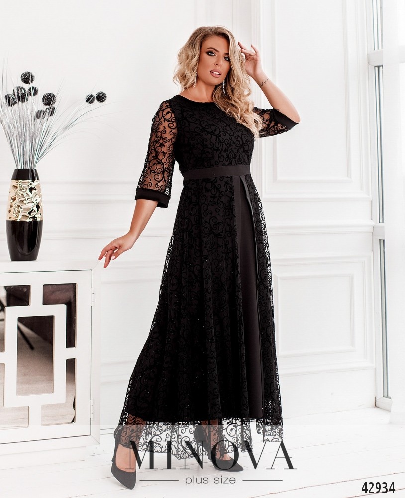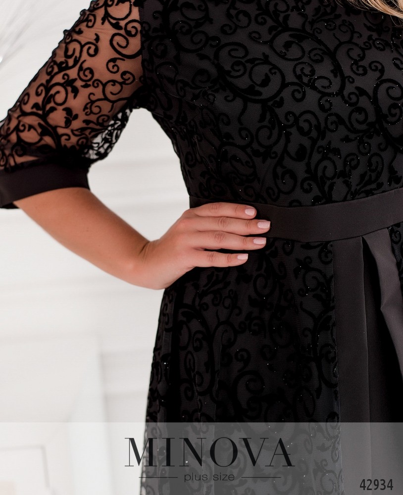 Нарядное платье батал без карманов, с потайной змейкой по спинке, с полукруглым вырезом горловины. Нижний слой мягкий, верхний - полупрозрачный узорчатый гипюр. Рукава без подкладки, с уплотнённым манжетом. Верхний слой на подоле подшит на талии, при ходьбе развевается, оторочен по краю разреза спереди плотной лентой.