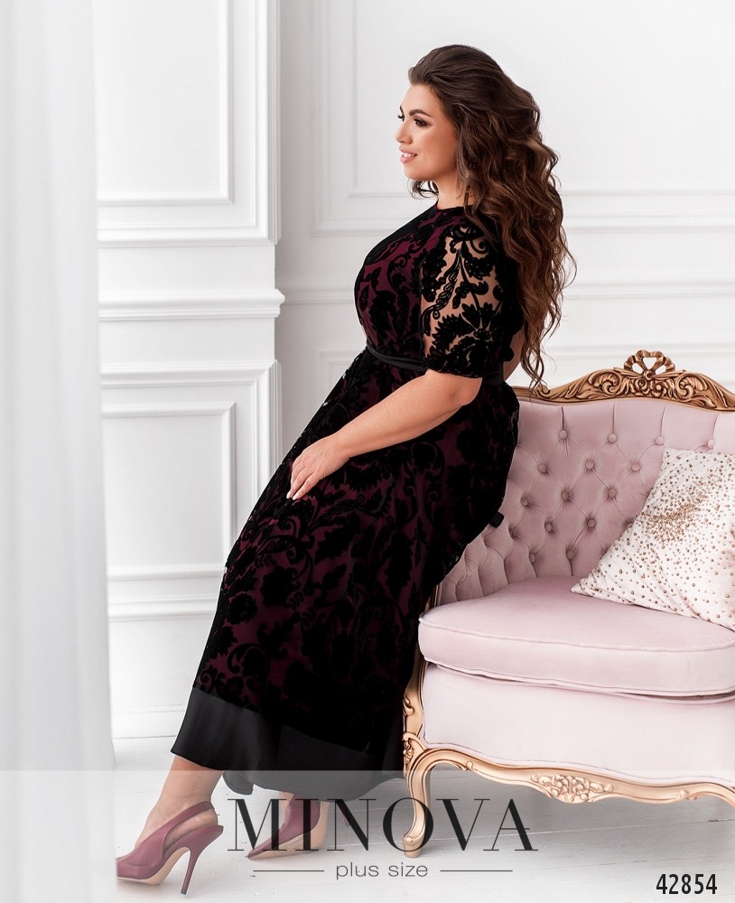 Элегантное платье плюс сайз с гладким длинным поясом. Платье А-силуэта, без застёжек и карманов, с полукруглым вырезом горловины. Нижний слой мягкий, верхний подшит на горловине, цветочный гипюр. Рукава без подкладки, с небольшими манжетами-оборками, в которые вшита резинка.