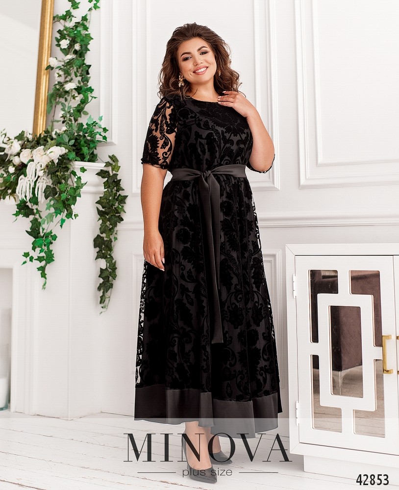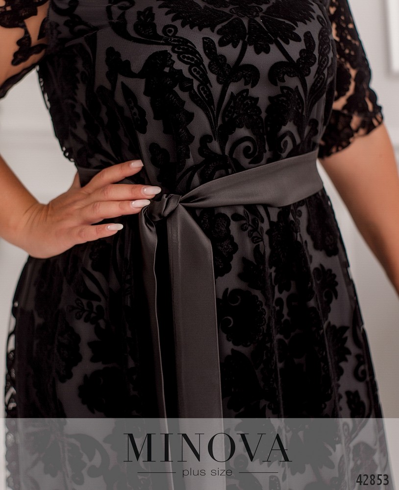 Элегантное платье плюс сайз с гладким длинным поясом. Платье А-силуэта, без застёжек и карманов, с полукруглым вырезом горловины. Нижний слой мягкий, верхний подшит на горловине, цветочный гипюр. Рукава без подкладки, с небольшими манжетами-оборками, в которые вшита резинка.