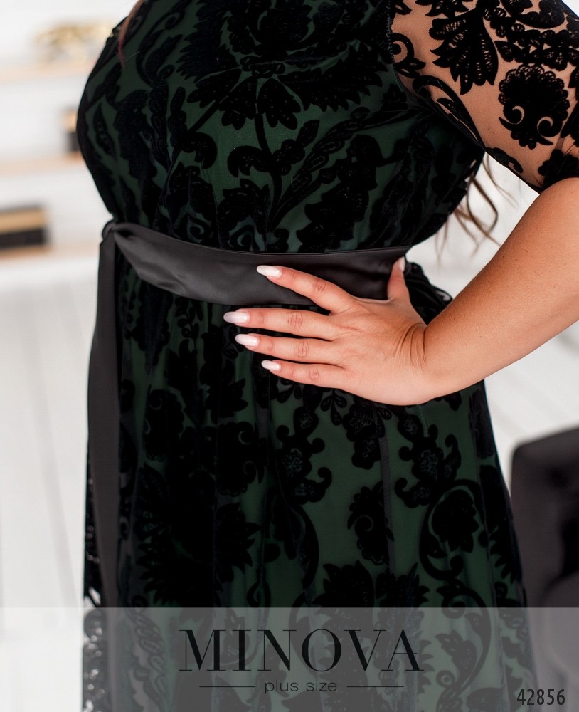 Элегантное платье плюс сайз с гладким длинным поясом. Платье А-силуэта, без застёжек и карманов, с полукруглым вырезом горловины. Нижний слой мягкий, верхний подшит на горловине, цветочный гипюр. Рукава без подкладки, с небольшими манжетами-оборками, в которые вшита резинка.