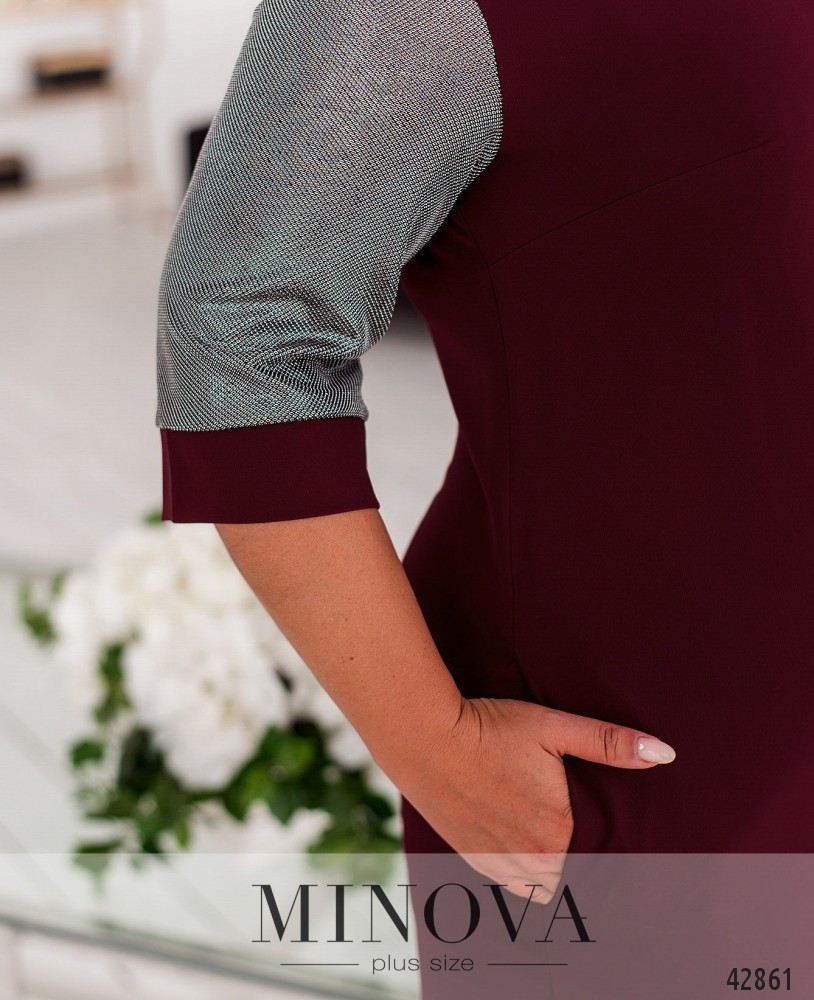 Элегантное платье большого размера с блестящими рукавами, украшенными люрексом. Манжеты плотные, без пуговиц. В наличии врезные карманы по бокам, застёжка - молния, вшитая по спинке. На груди вытачки, вырез горловины полукруглый.