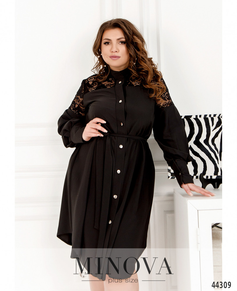 Романтичное платье-рубашка большого размера с поясом в тон, воротничок - небольшая стоечка. Застёгивается на ряд пуговиц спереди на планке, от воротничка до низу. Рукава с удлинёнными манжетами, на манжетах по одной пуговке. Верх украшен ажурным кружевом спереди и по спинке. Карманов нет.