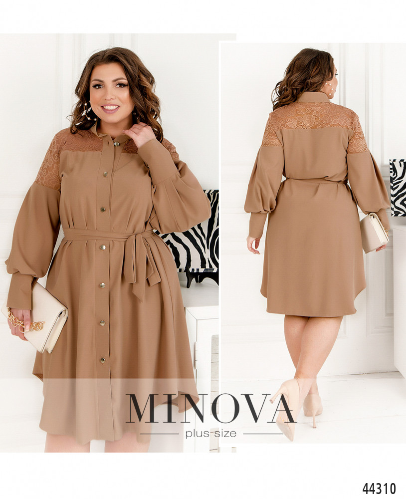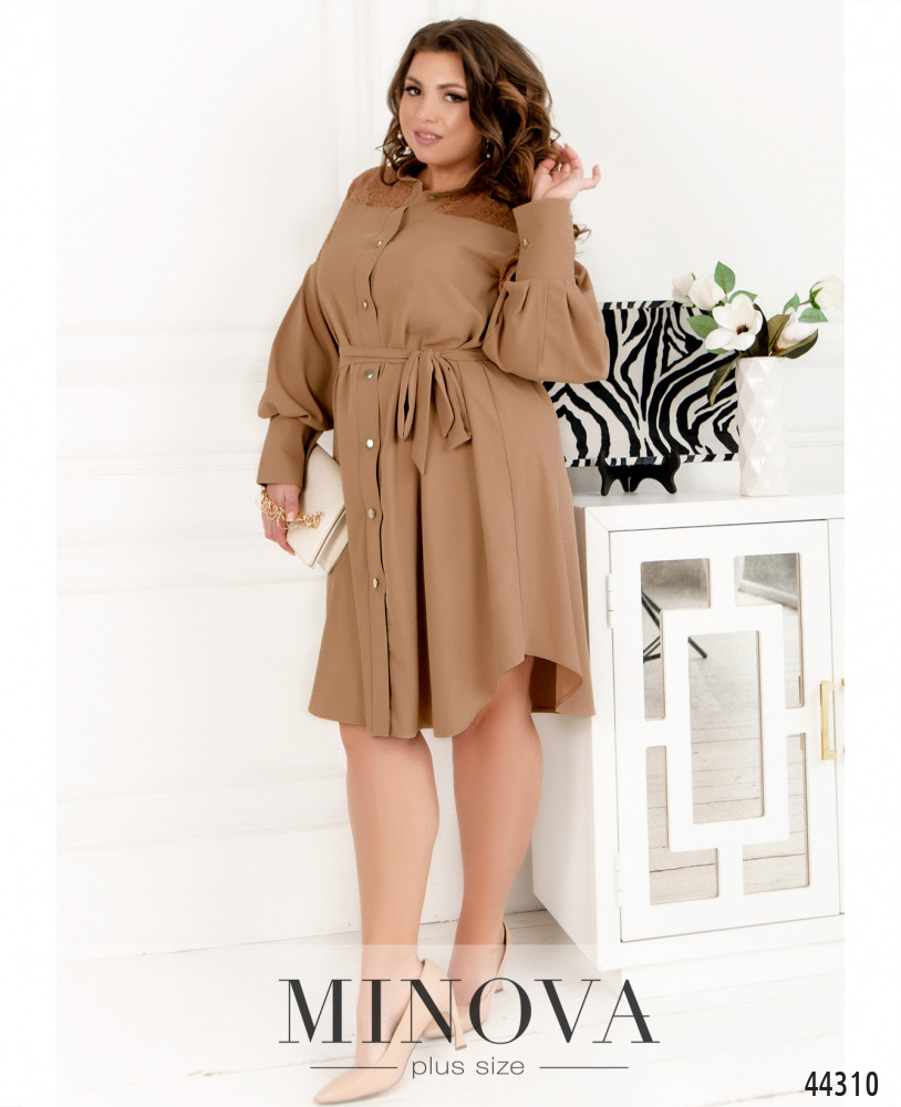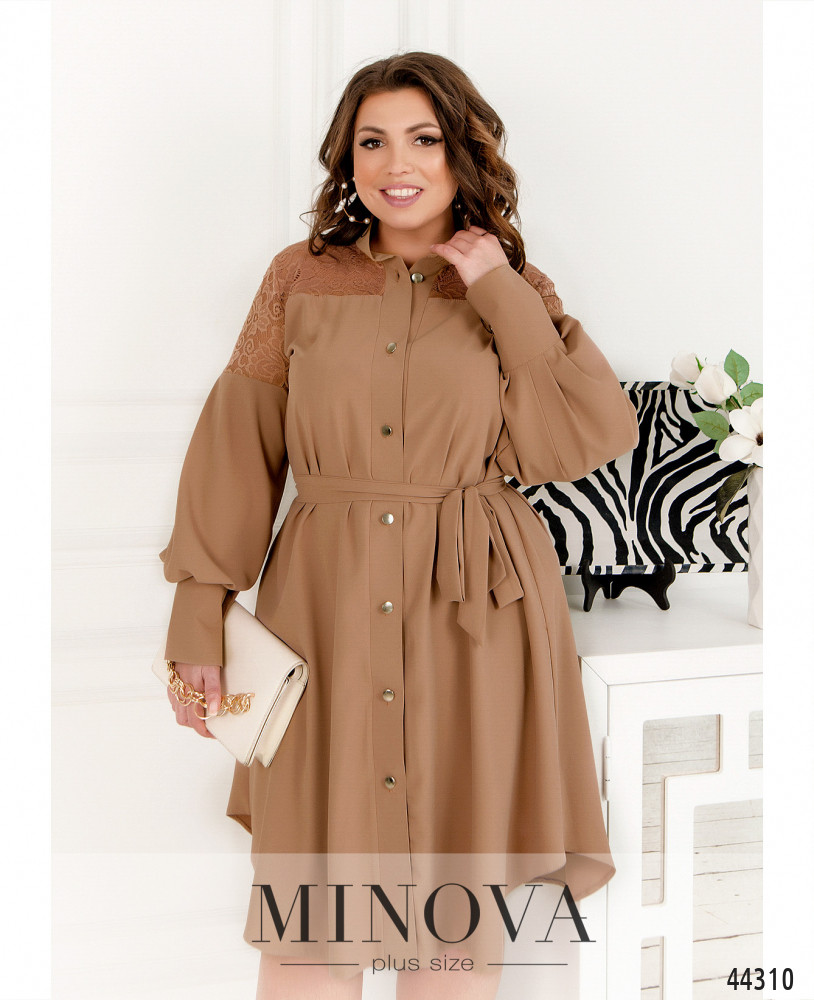 Романтичное платье-рубашка большого размера с поясом в тон, воротничок - небольшая стоечка. Застёгивается на ряд пуговиц спереди на планке, от воротничка до низу. Рукава с удлинёнными манжетами, на манжетах по одной пуговке. Верх украшен ажурным кружевом спереди и по спинке. Карманов нет.