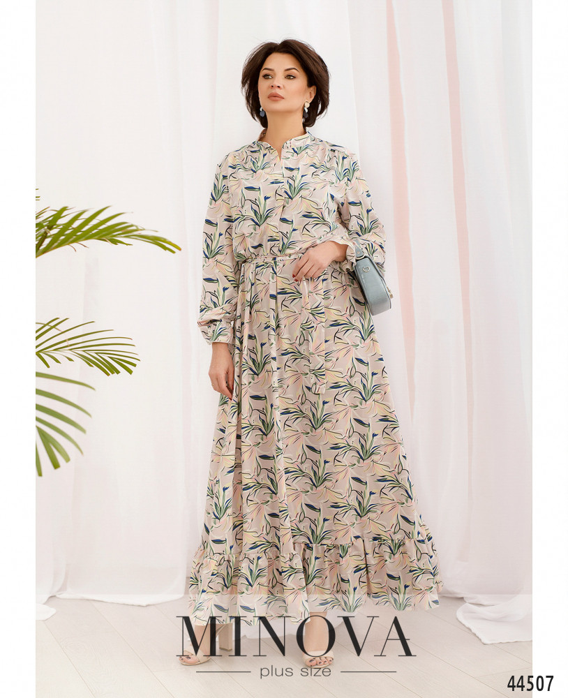 Нежное романтичное платье батал со вшитыми в рукава на запястьях шнурками и мягкими оборками на манжете. До талии от воротничка-стоечки - элегантные пуговки на планке. На груди вытачки. Подол отрезной. На подоле внизу оборки. Карманов нет.