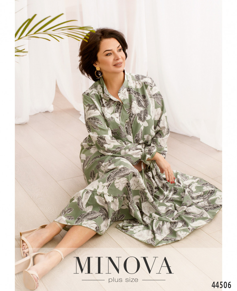 Нежное романтичное платье батал со вшитыми в рукава на запястьях шнурками и мягкими оборками на манжете. До талии от воротничка-стоечки - элегантные пуговки на планке. На груди вытачки. Подол отрезной. На подоле внизу оборки. Карманов нет.