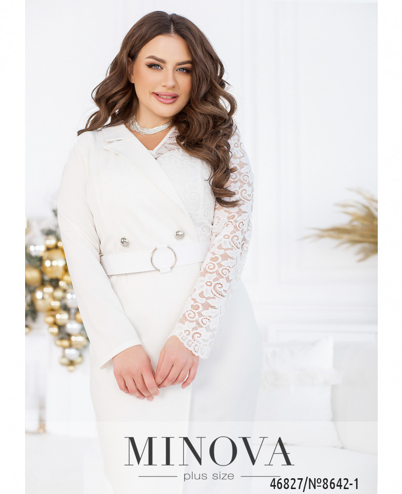 Благодаря этому изящному платью необычного кроя ваш новогодний образ получится стильным и шикарным. Верх модели выполнен из двух видов тканей: гладкой однотонной и полупрозрачной кружевной, а подол подшит на запах. Платье застегивается на змейку, вшитую по спинке.