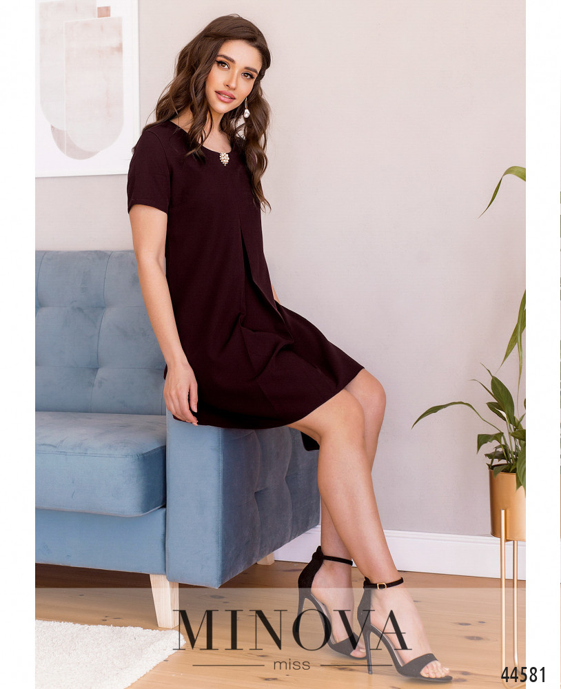 Элегантное и минималистичное платье без карманов, на талии ткань расходится оборкой. Вырез горловины полукруглый, украшен декоративным элементом. На груди вытачки. Рукава короткие, без манжет. Застёжка - вшитая по спинке молния.