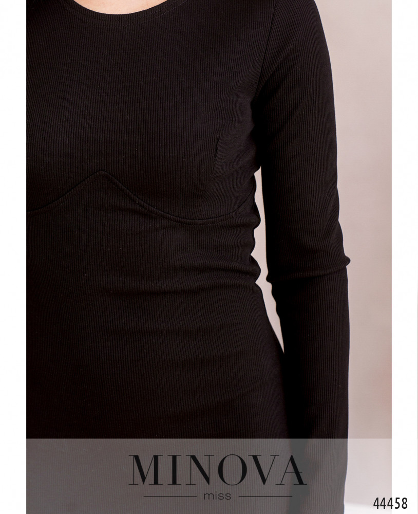 Минималистичное платье с полукруглым вырезом горловины и лифом, подшитым по типу корсета к подолу. Рукава без манжет, застёжек и карманов нет, силуэт приталенный.