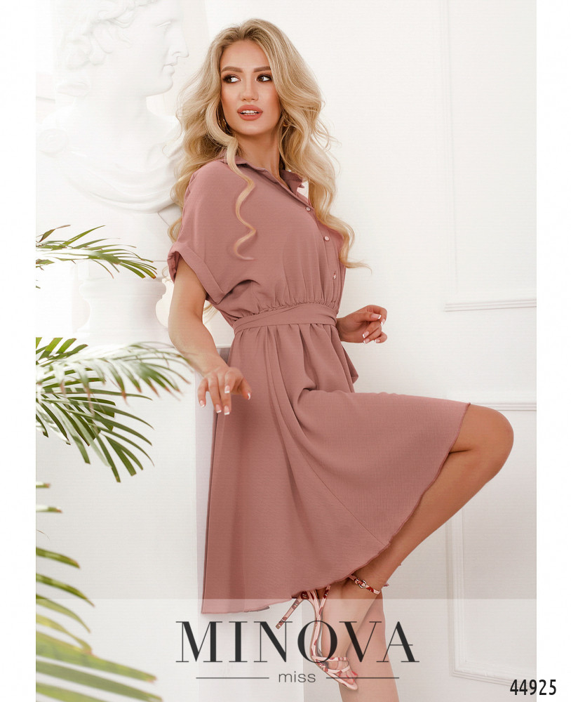 Элегантное минималистичное платье с отложным воротничком и рядом пуговиц спереди на планке до талии. Рукава короткие, с небольшим отворотом, фасона "летучая мышь". В пояс вшита резинка, подол ниспадает оборками, на лифе ткань также немного присобрана. Карманов нет.
