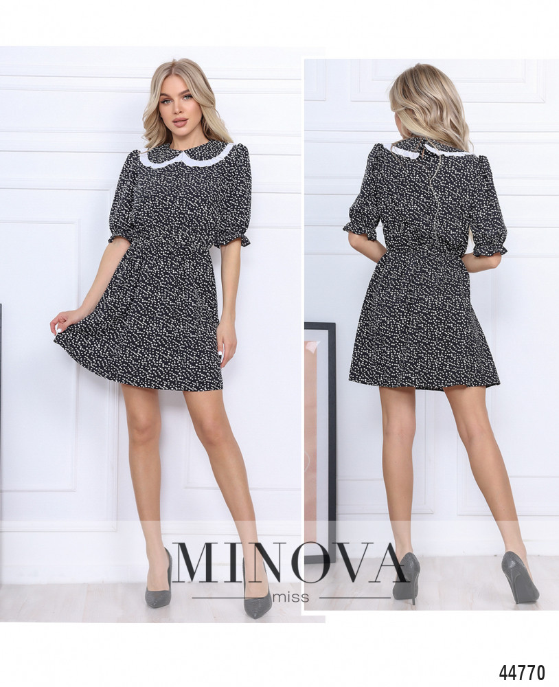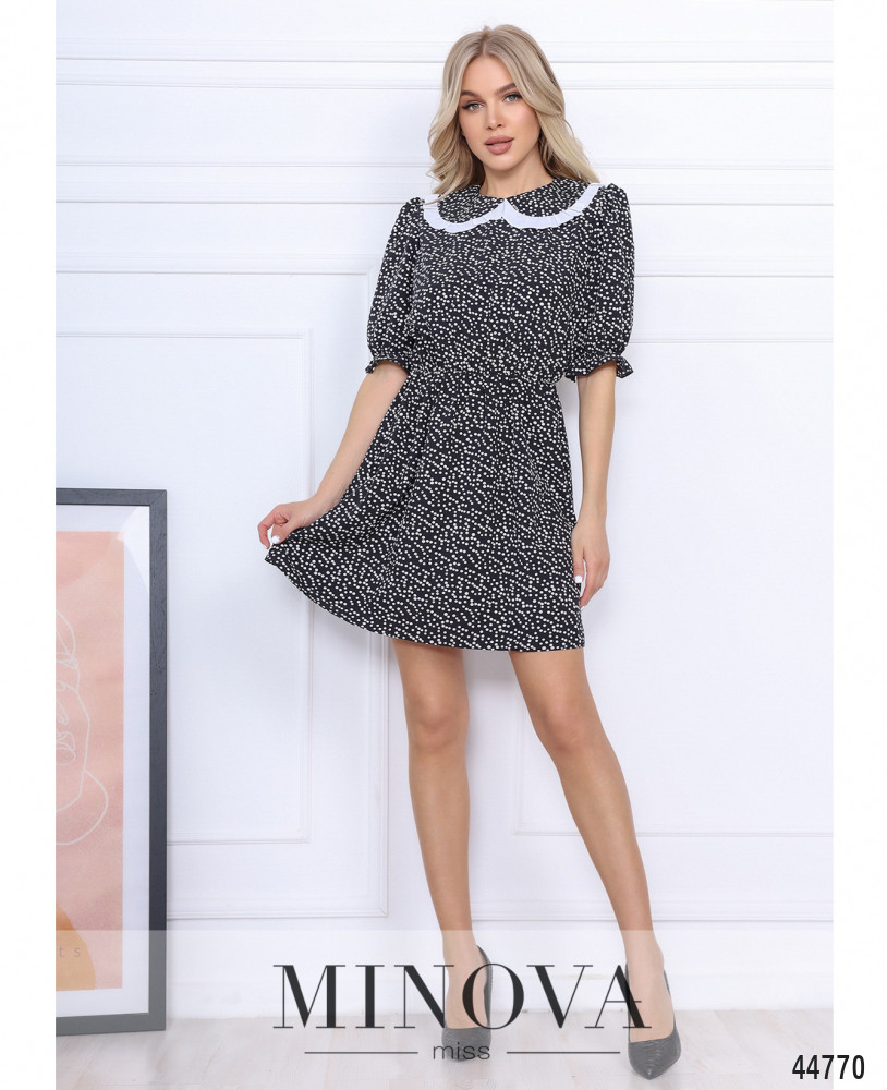 Элегантное платье в горошек с отложным воротничком, украшенным тесьмой. Рукава со вшитыми резинками и небольшими оборками. Карманов нет, застёжка - пуговка сзади под шеей. В талию вшита резинка.