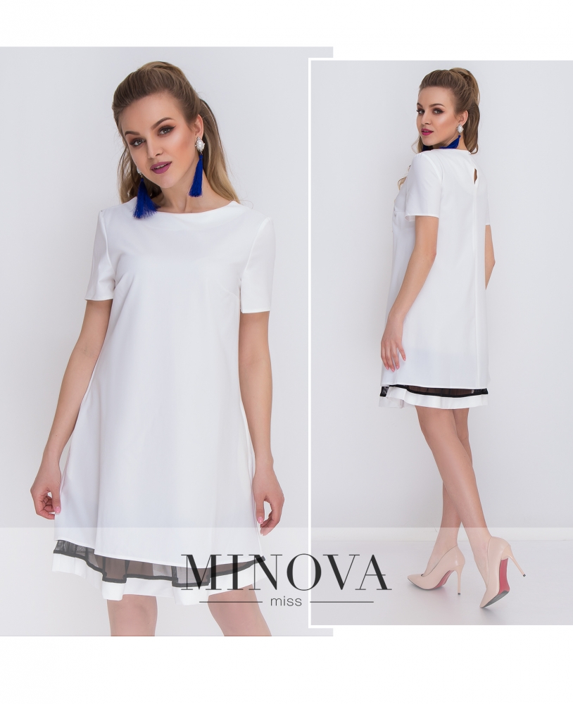 Платье А-силуэта с короткими рукавами и сетчатым подолом. Подкладка изготовлена из сетки и прошита кантом внизу. На спинке горловина застегивается на пуговицу.