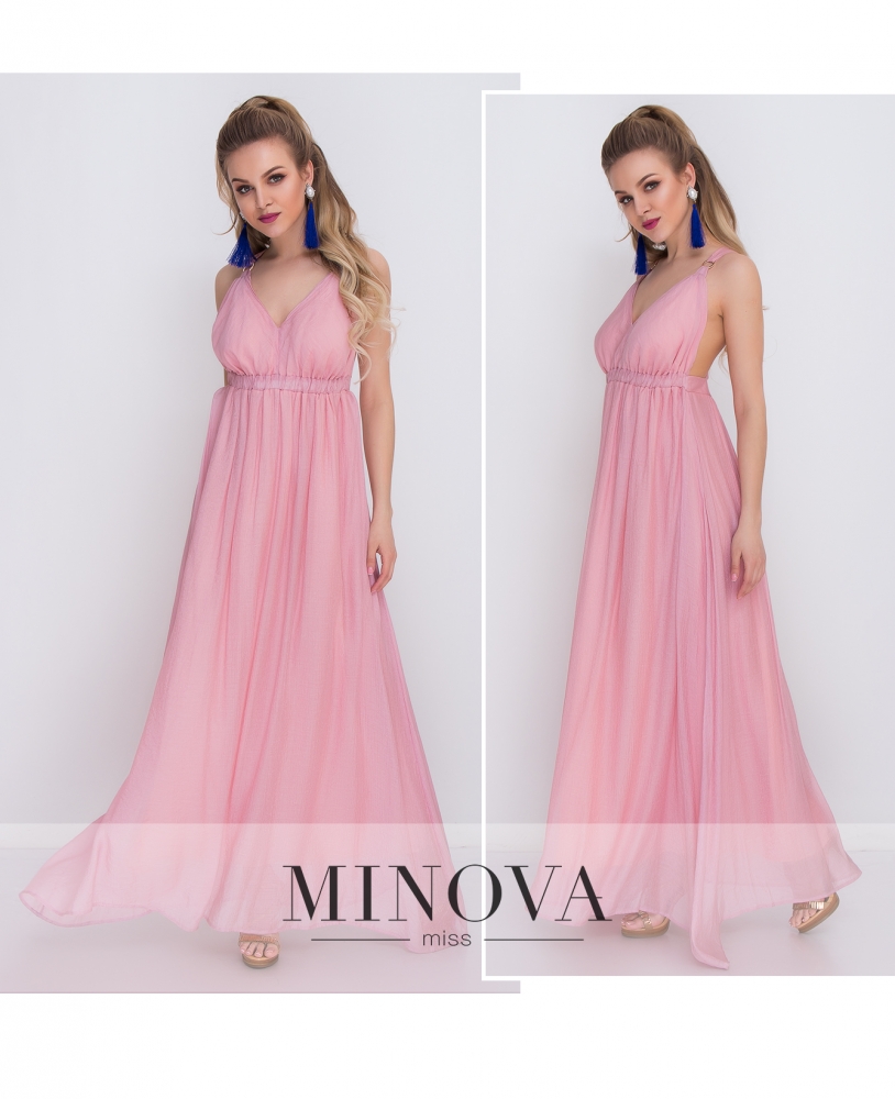 Летящее макси-платье на завышенной талии и с открытой спинкой. Лиф на широких бретелях с кольцами, которые на спинке переплетаются на крест. Драпированный подол состоит из двух слоев ткани.
