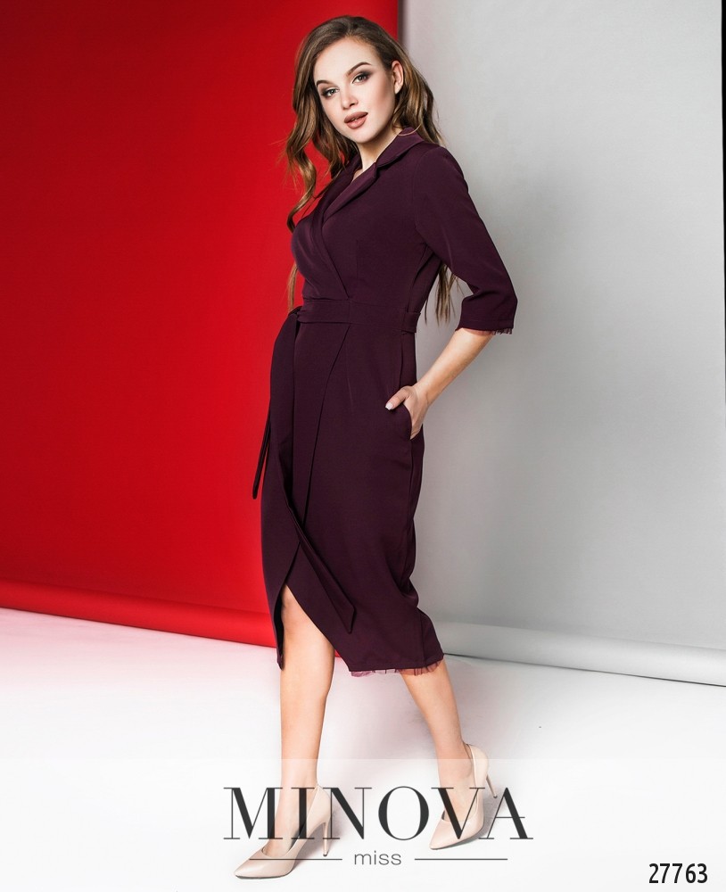 Платье с эффектом запАха и съемным поясом в тон. Отрезное от талии лиф с отложным воротником и рукавами ¾. Рукава и подол оформлено мелкими складками из сетки в тон. Подол дополнен скрытыми карманами. Платье застегивается на вшитую боковую молнию.