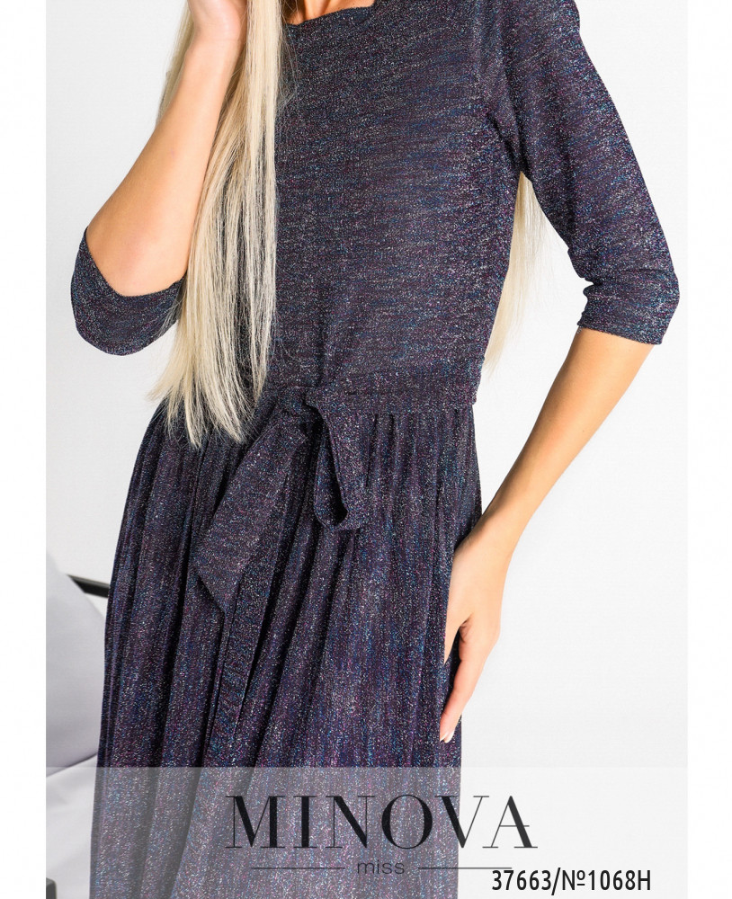 Элегантное нарядное платье с люрексом и плиссированным подолом. В комплекте пояс. Вырез горловины широкий, полукруглый, застёжек и карманов нет, рукава без манжет. Пояс/аксессуар входит в комплект.