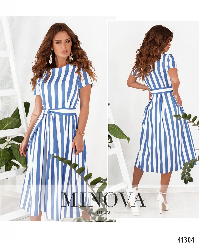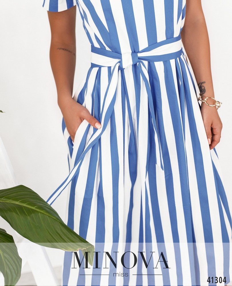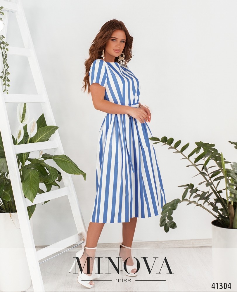 Яркое полосатое платье с поясом, подол подшит к лифу и присобран оборками. Застёжка - вшитая по спинке потайная молния. По бокам - врезные карманы. Рукава короткие, без манжет.