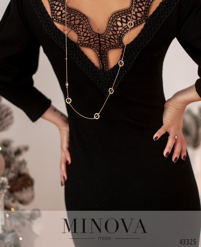 Романтичное платье с оригинальным "епископским" рукавом, с удлинёнными манжетами без пуговиц. Декольте V-образное, украшено кружевом. Застёжек и карманов нет.