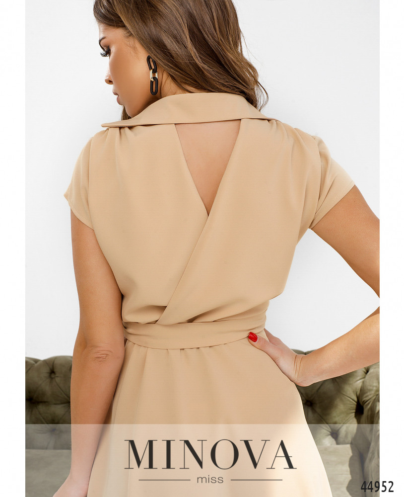 Элегантное платье с глубоким декольте и подшитым на запАх лифом, воротничок отложной, на спинке под воротничком - V-образный вырез. Лиф с подшитой подкладкой. В пояс вшита резинка, подол ниспадает мягкими оборками. На талии шлейки для пояса. Рукава-крылышки без манжет. Застёжек и карманов нет.