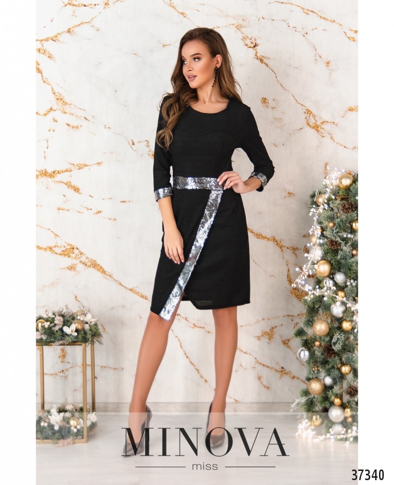Приталенное нарядное платье из мягкой ткани с люрексом. На подоле и на манжетах – вставка ленты с пайетками. Вырез горловины полукруглый, неглубокий, Спереди и сзади – продольные вытачки. Подол подшит на запАх. Карманов нет. Застёжка – вшитая по спинке змейка.